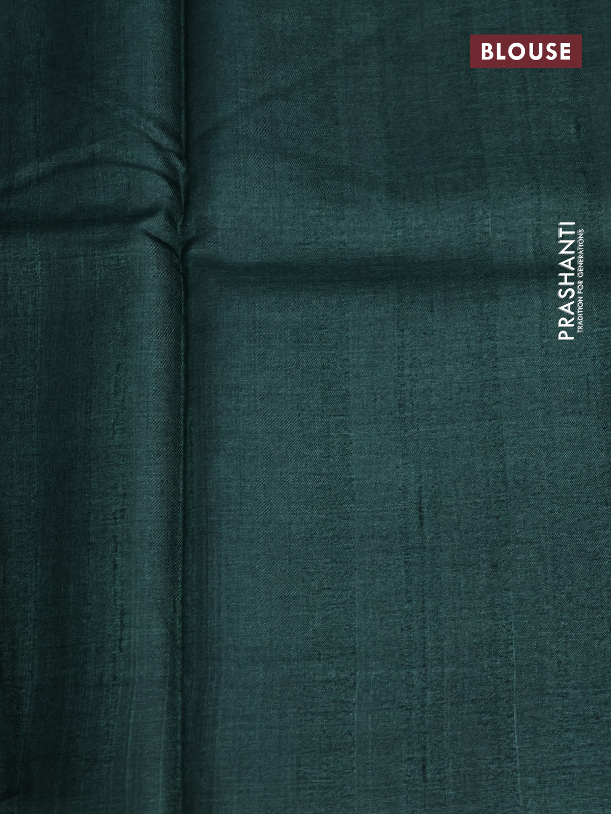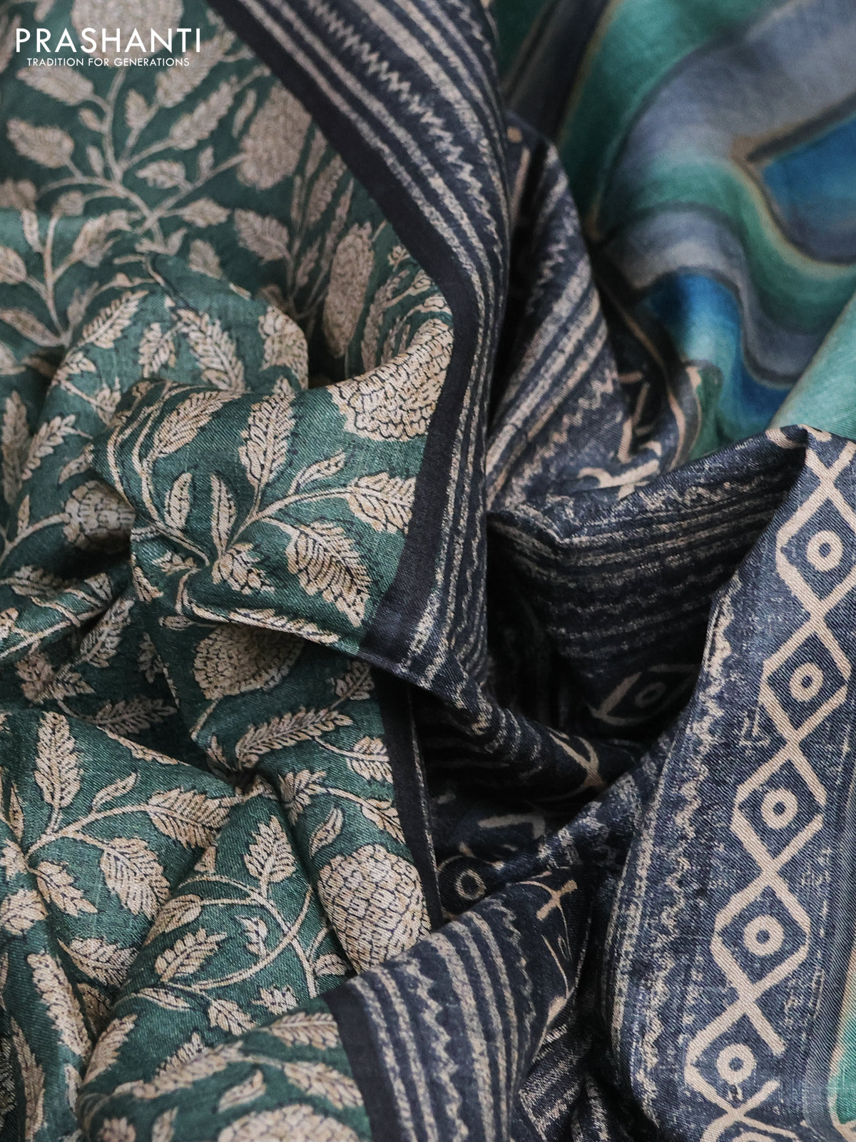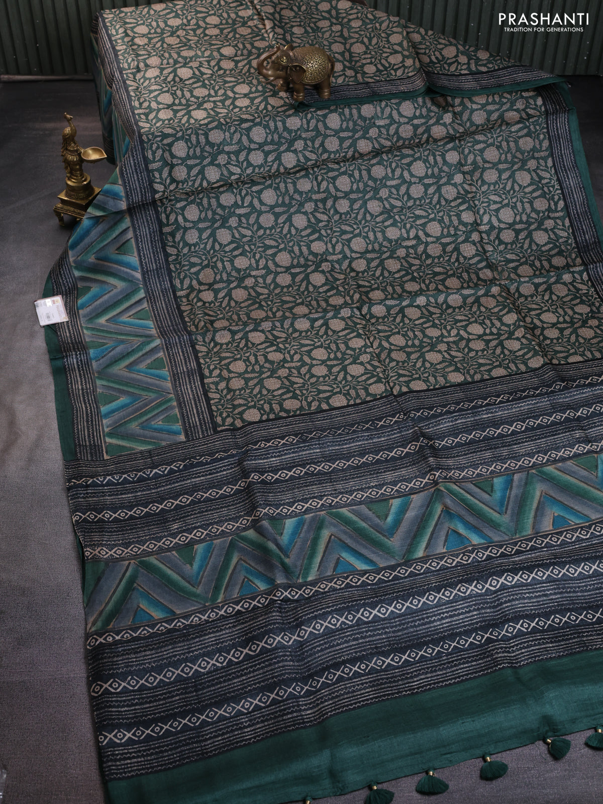 Pure tussar silk saree dark green with allover kalamkari prints and printed border