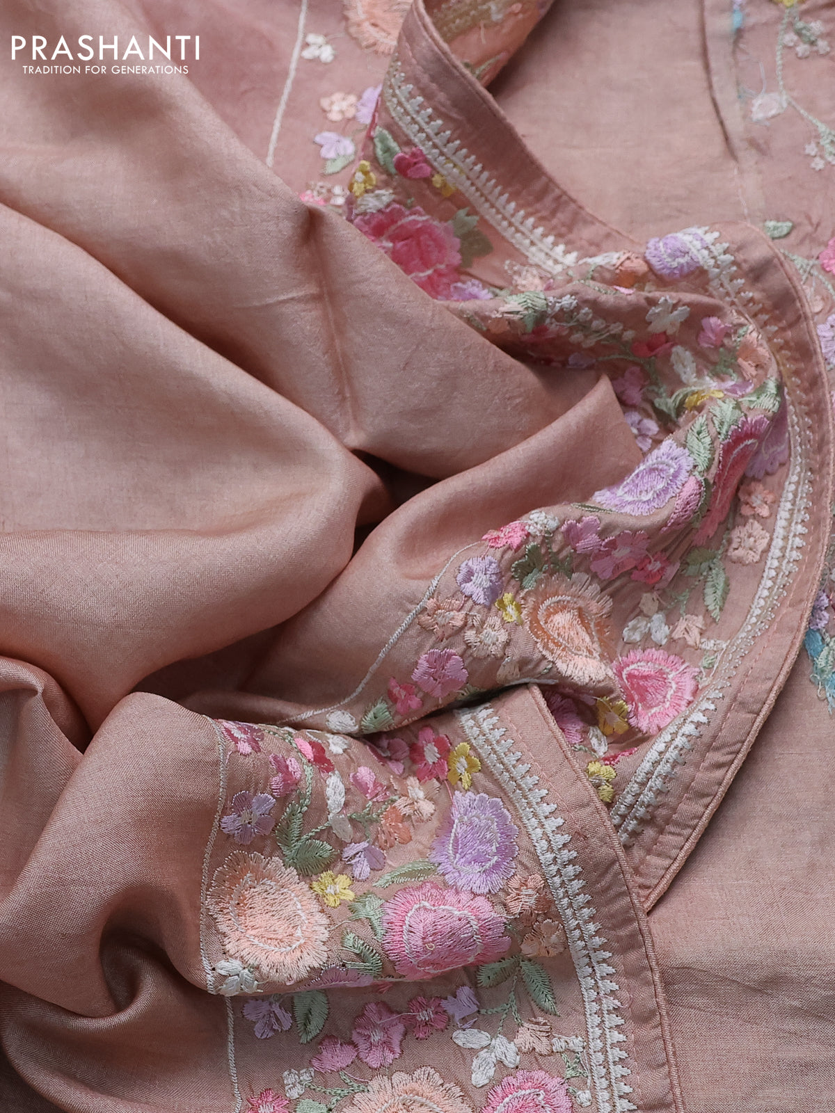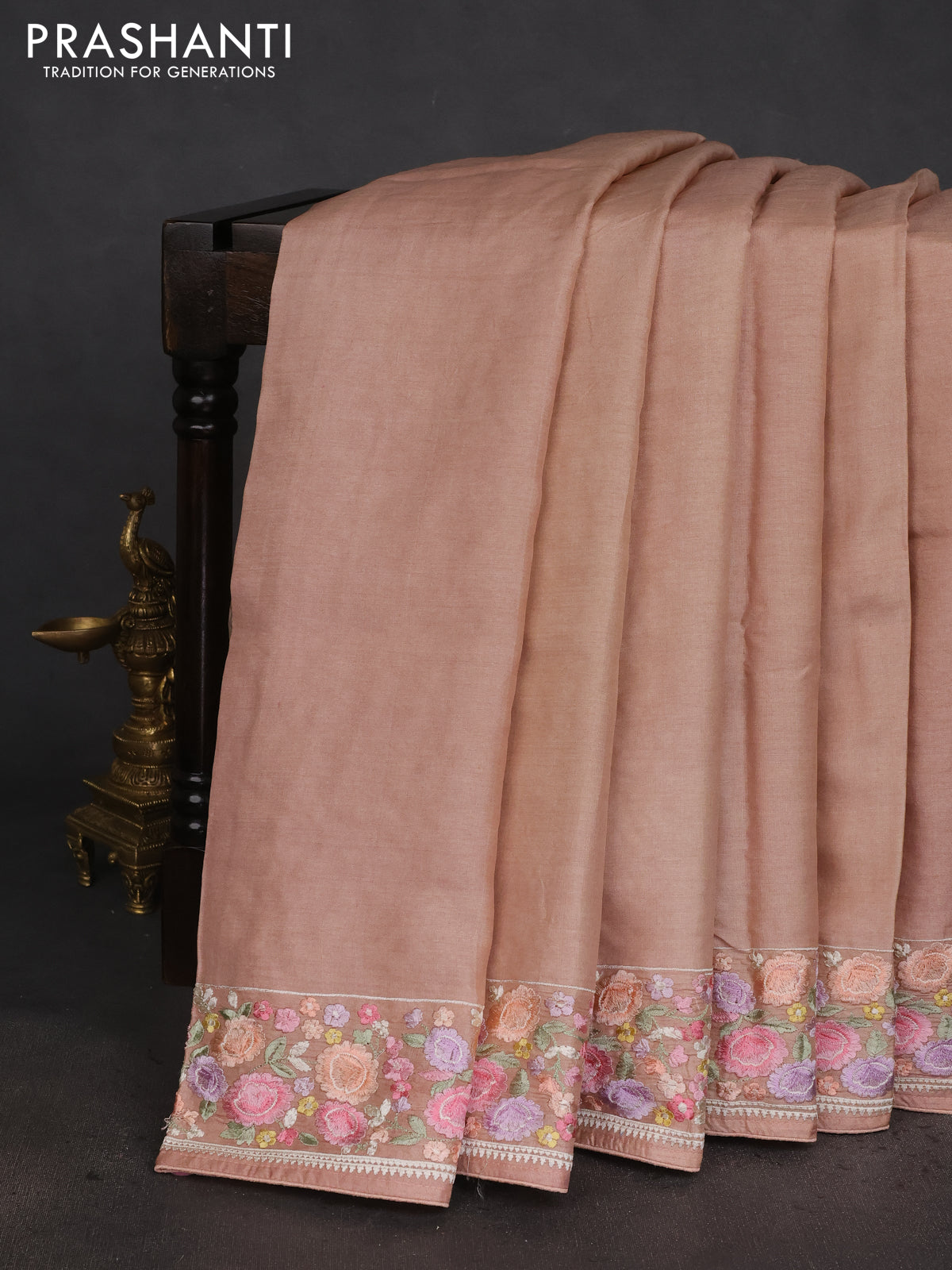 Pure tussar silk saree dark sandal with plain body and floral design embroidery work border