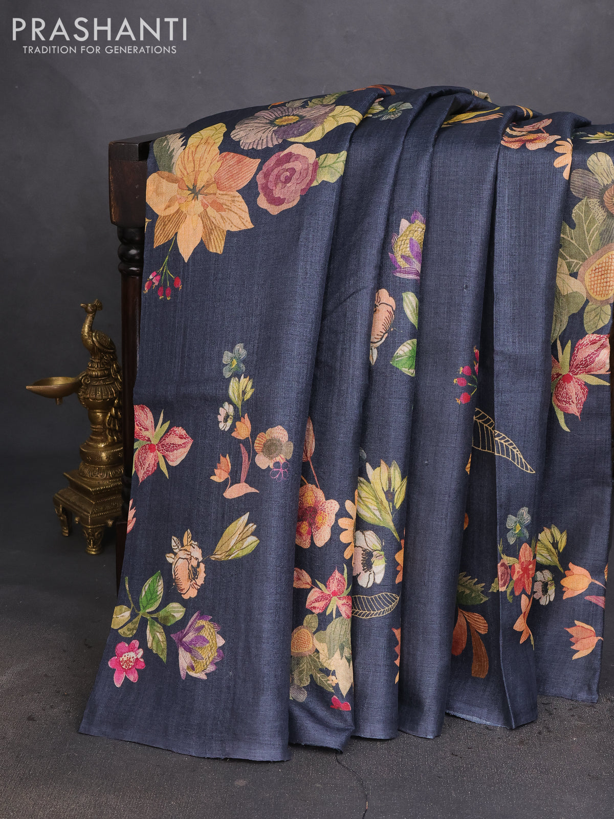 Pure tussar silk saree elephant grey with allover floral digital prints in borderless style
