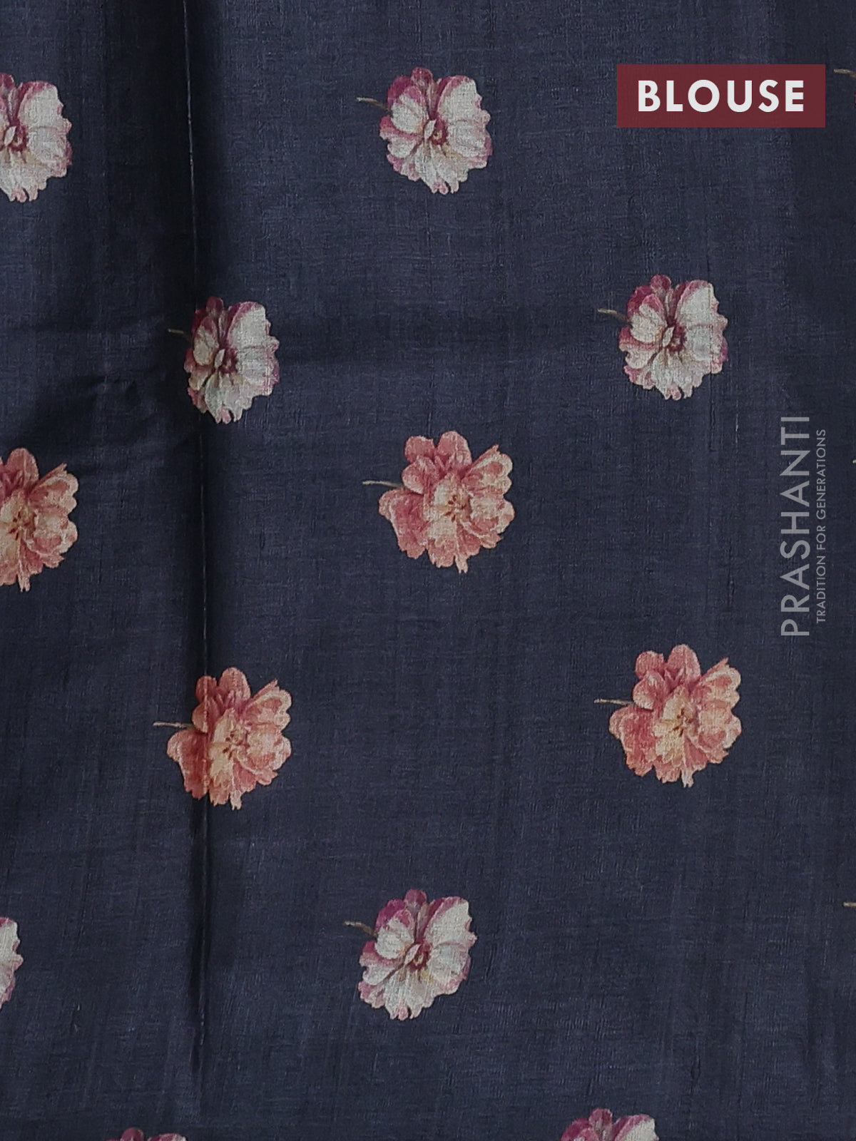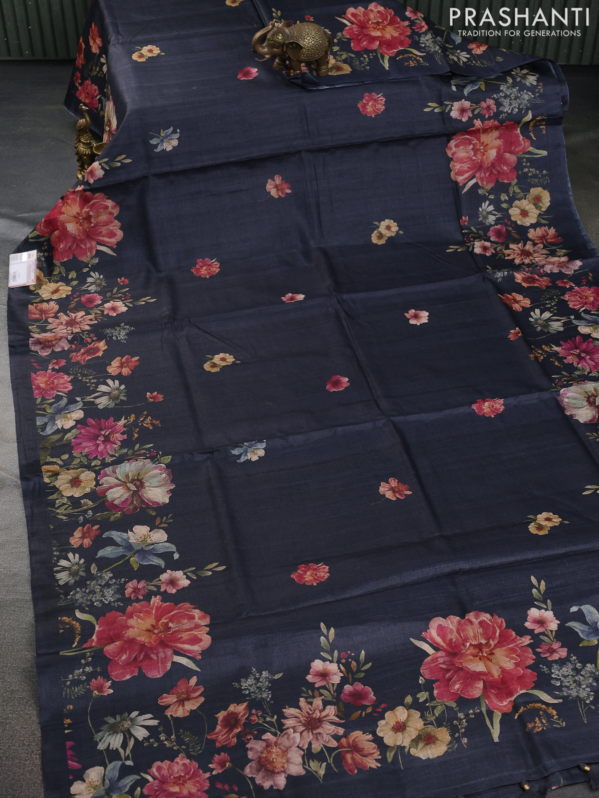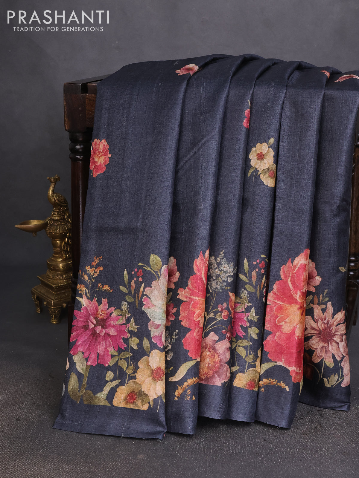 Pure tussar silk saree elephant grey with allover floral digital prints in borderless style