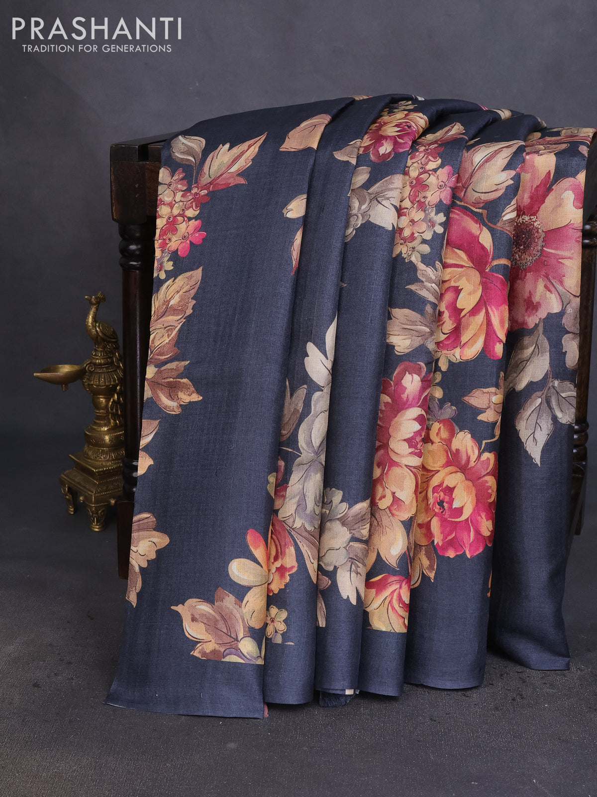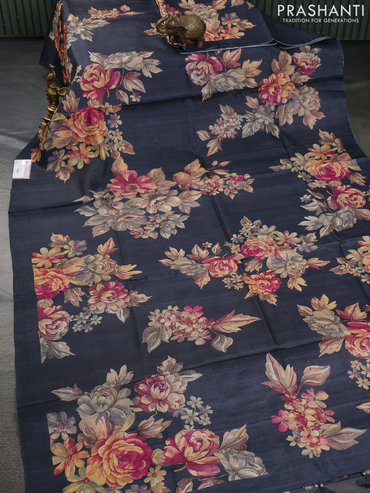 Pure tussar silk saree elephant grey with allover floral digital prints in borderless style