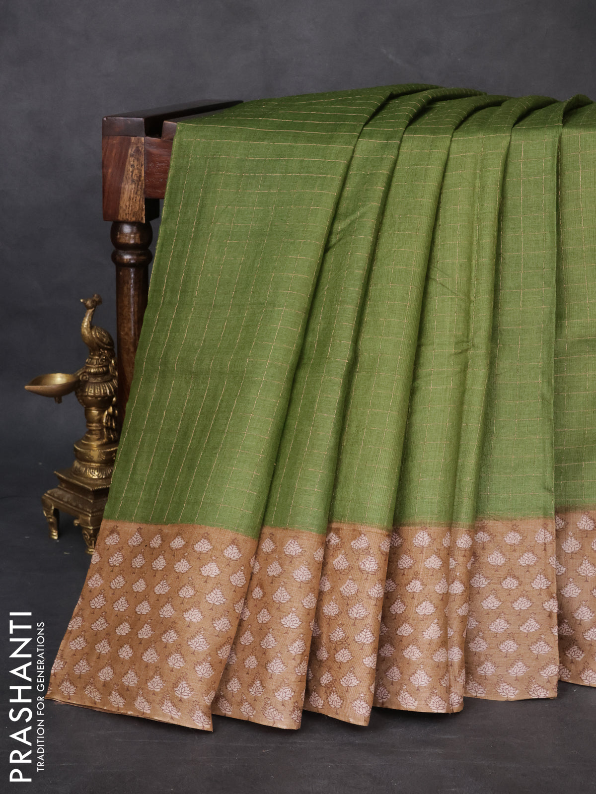 Pure tussar silk saree green and beige with allover zari checked pattern and printed border