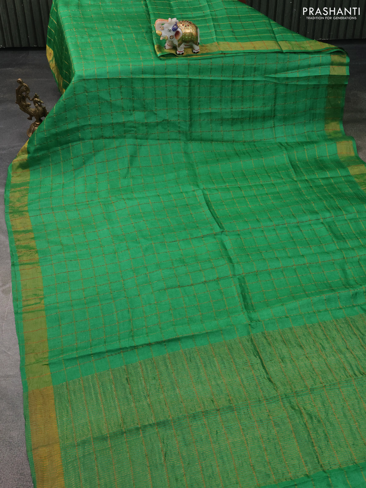 Pure Tussar Silk Saree green and brown with allover zari checked pattern and zari woven border
