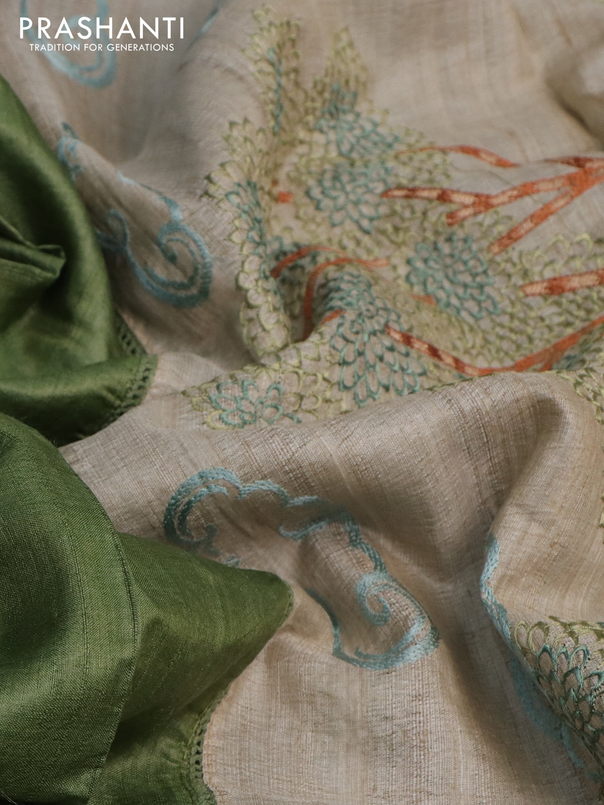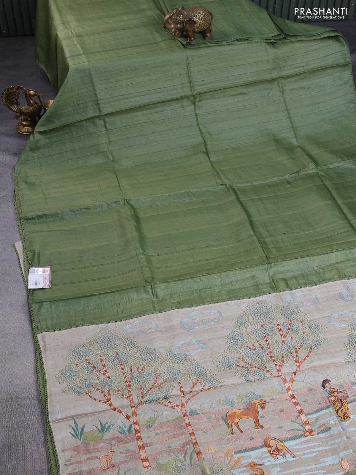 Pure tussar silk saree green and cream with plain body and embroidery work pallu