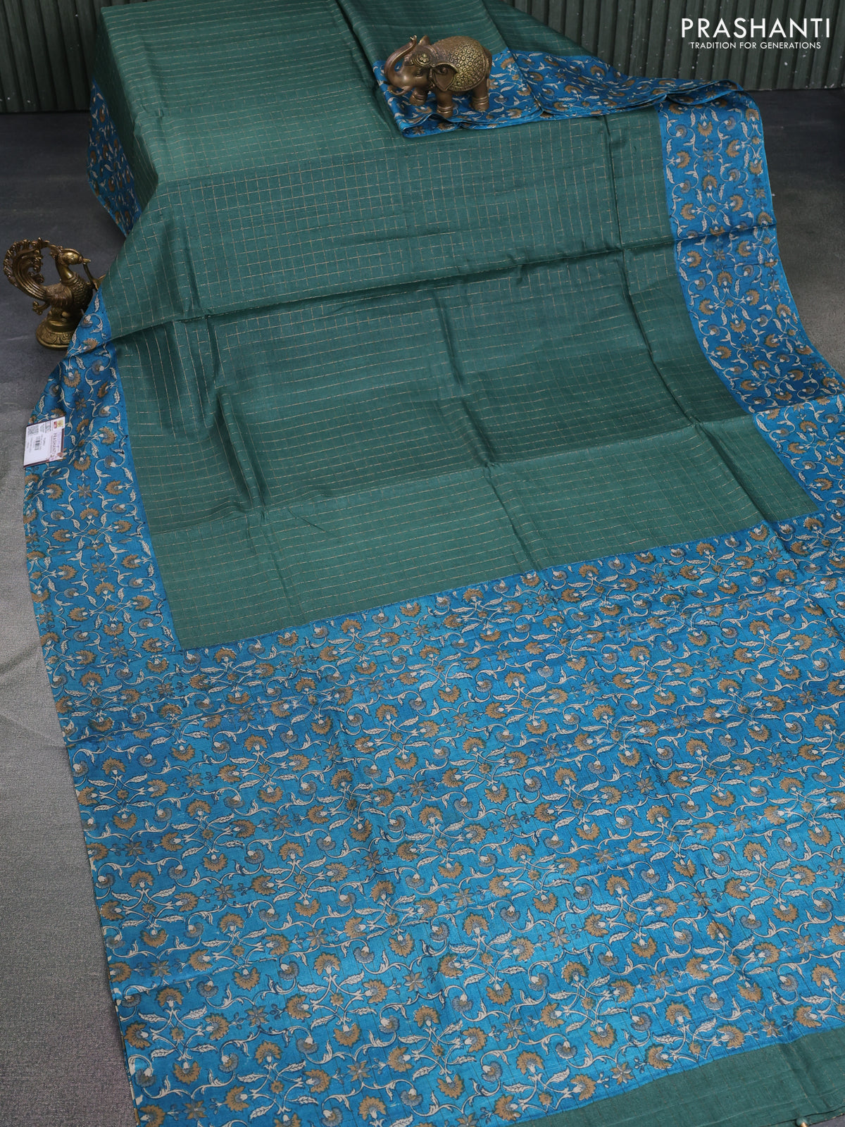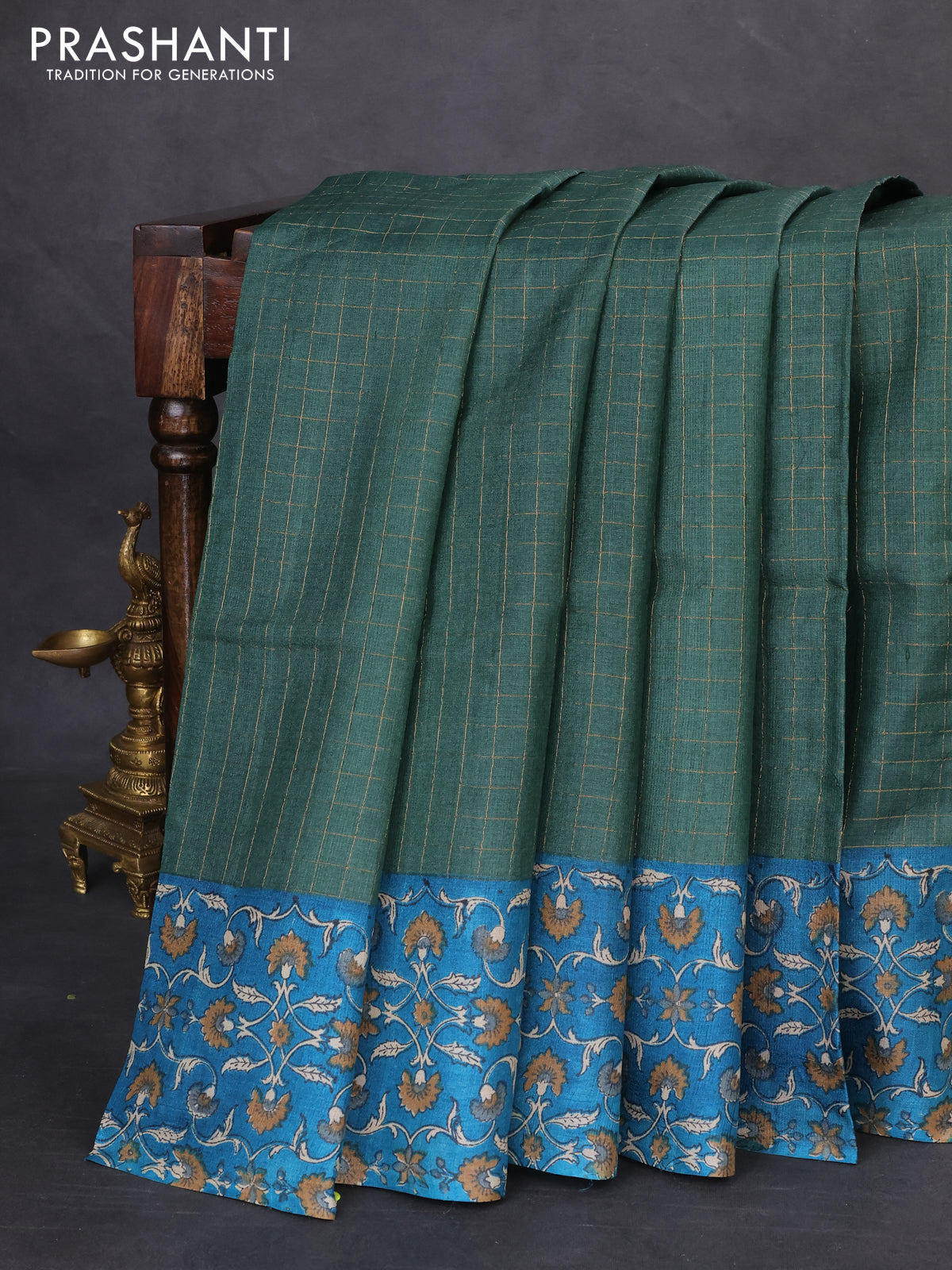 Pure tussar silk saree green and cs blue with allover zari checked pattern and kalamkari printed border