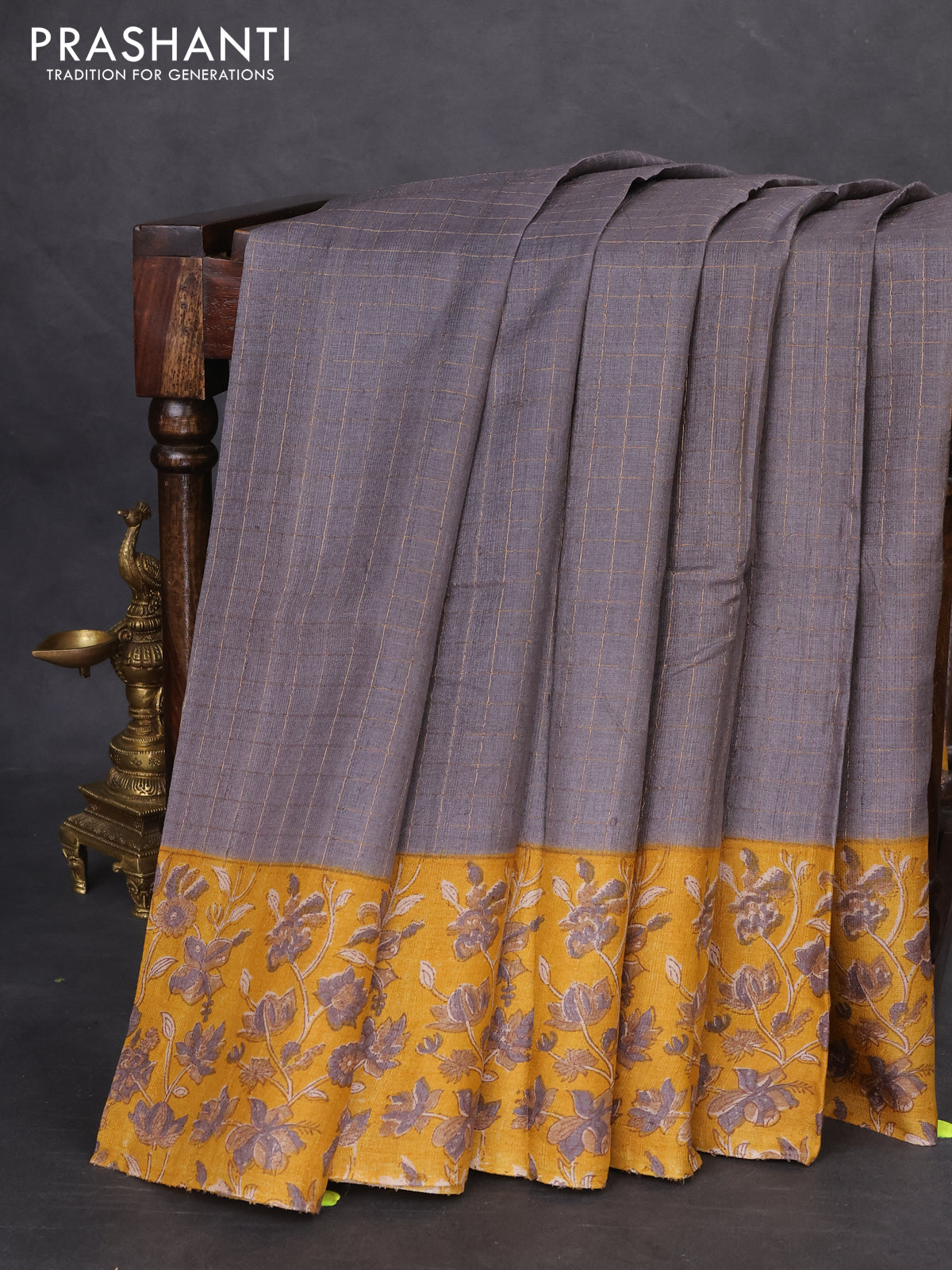 Pure tussar silk saree grey and mustard yellow with allover zari checked pattern and kalamkari printed border