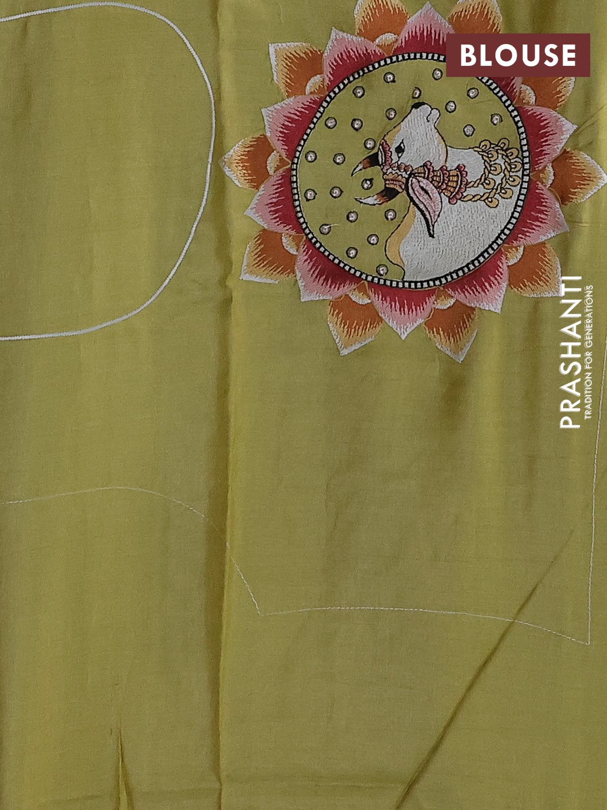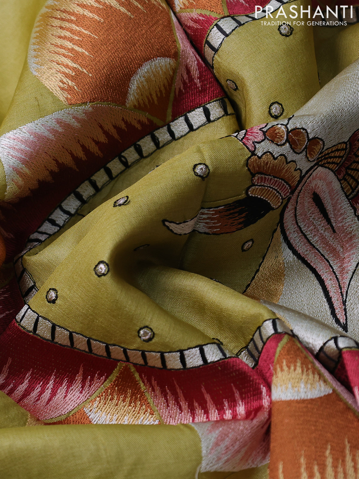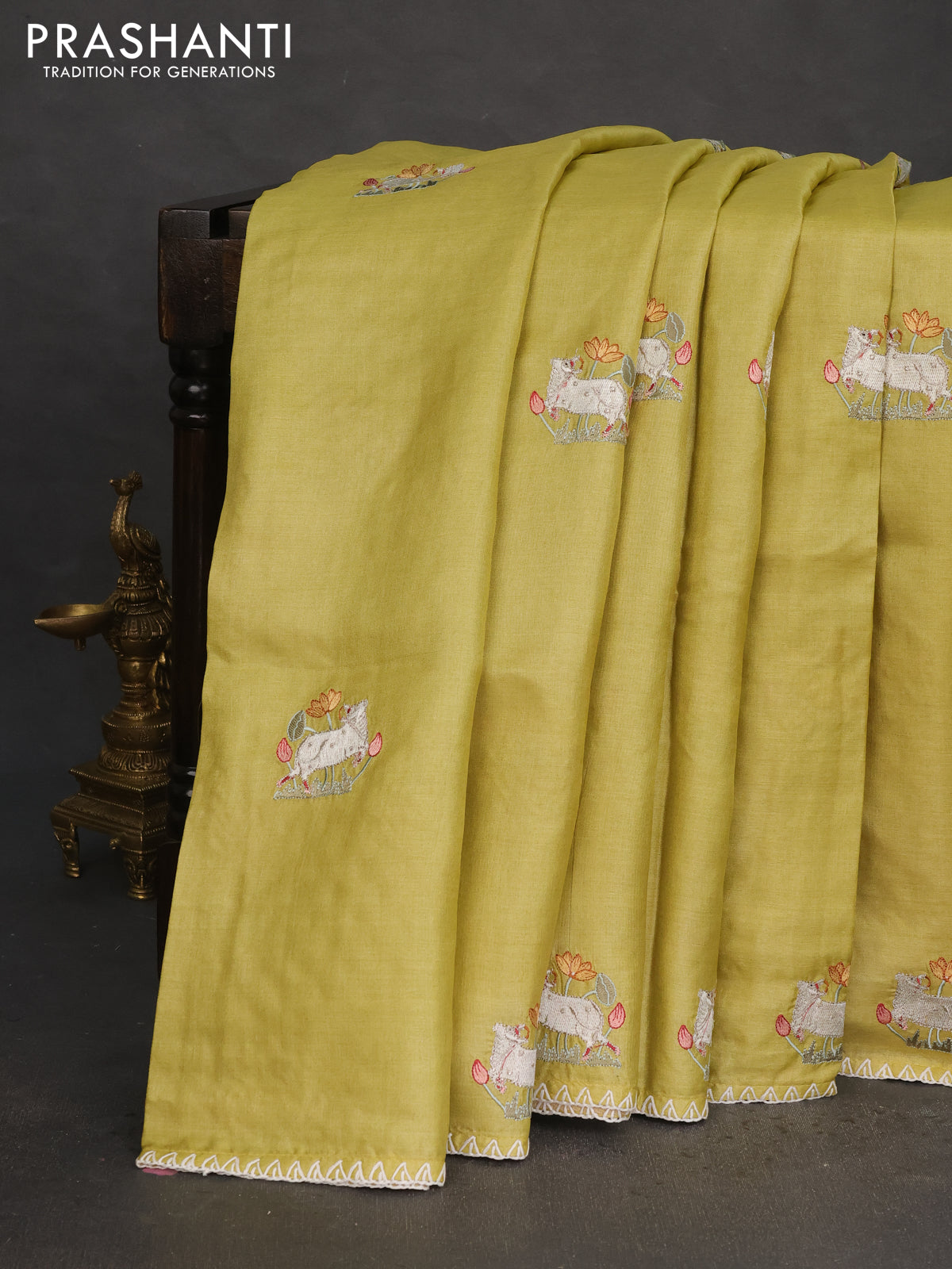Pure tussar silk saree lime yellow with pichwai design embroidery work buttas and simple border