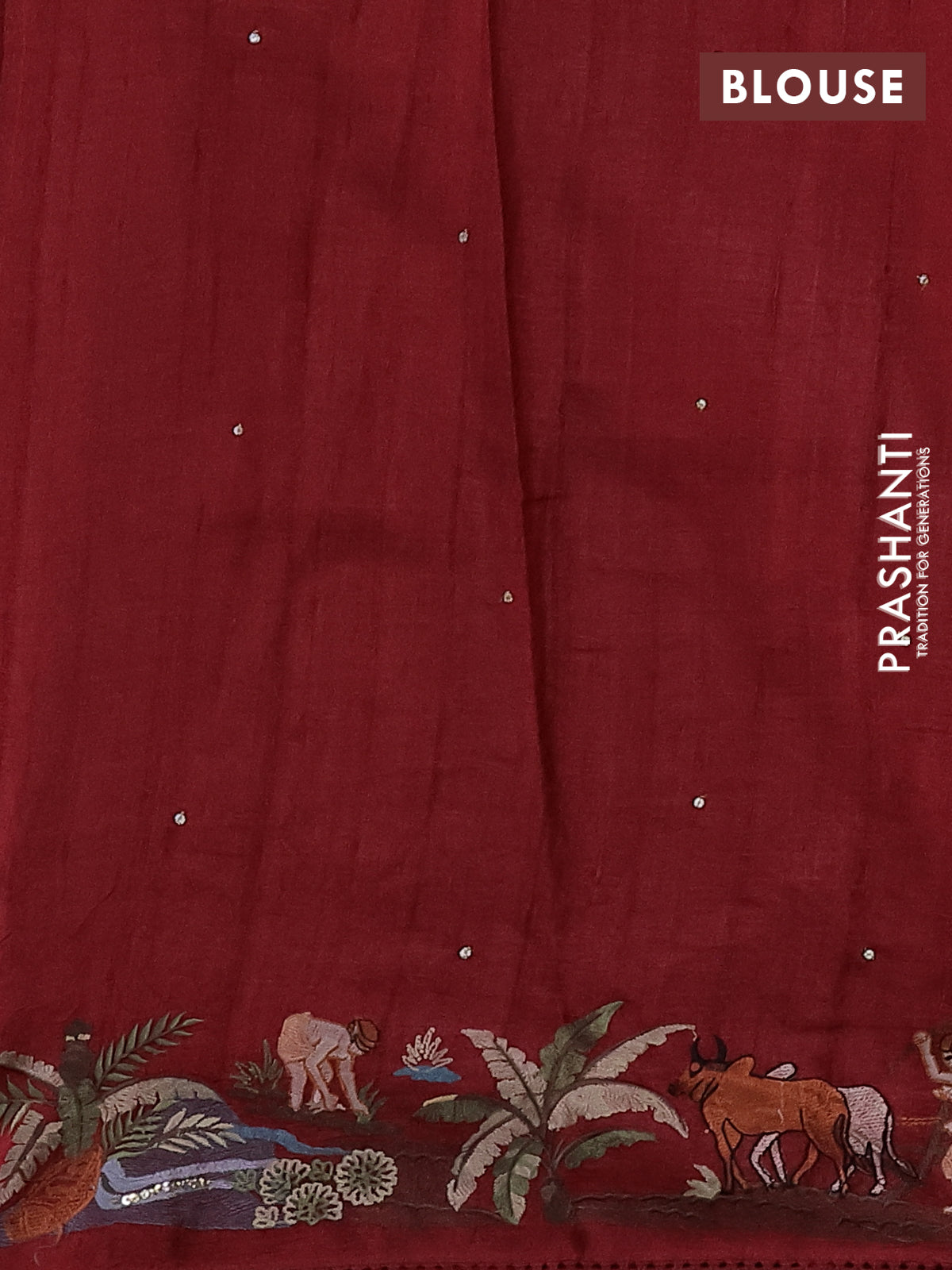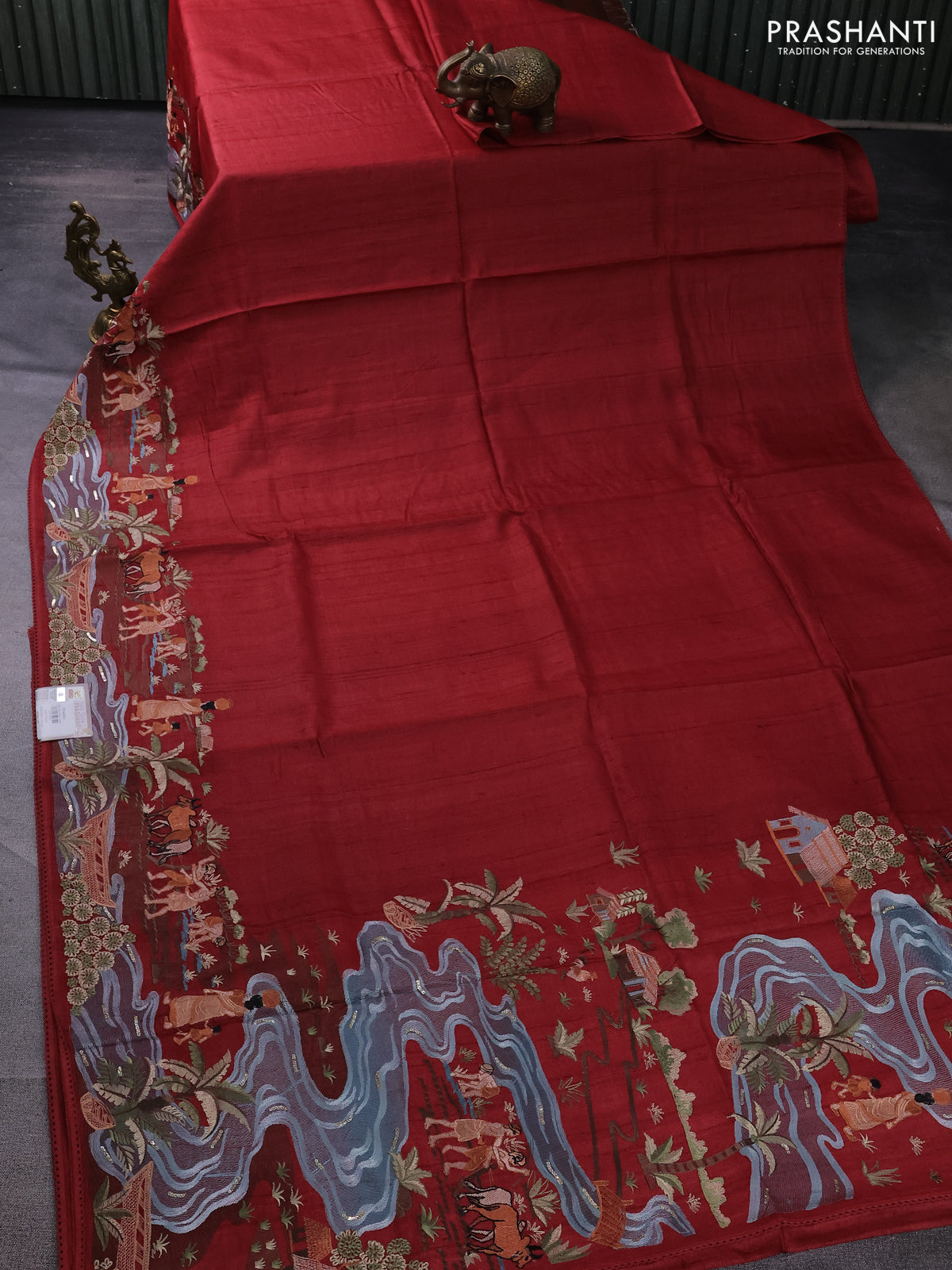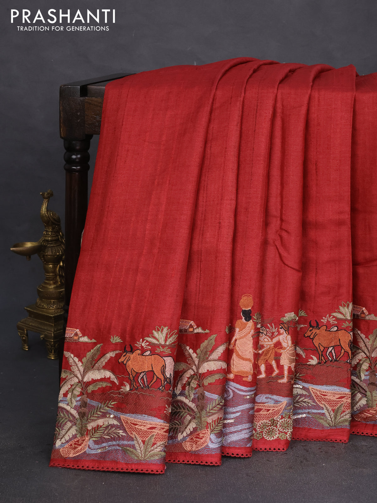 Pure tussar silk saree maroon with plain body and embroidery work border