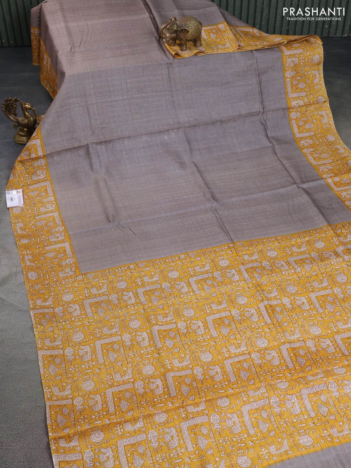 Pure tussar silk saree mustard yellow and brown with allover zari checked pattern and kalamkari printed border