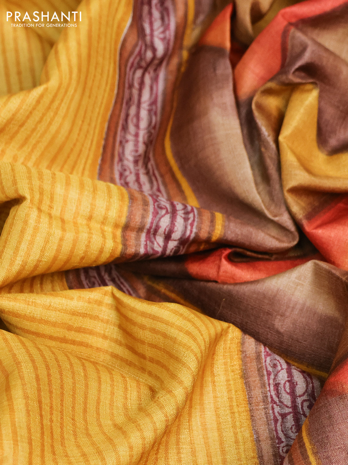 Pure tussar silk saree mustard yellow and multi colour with allover stripes pattern and printed border
