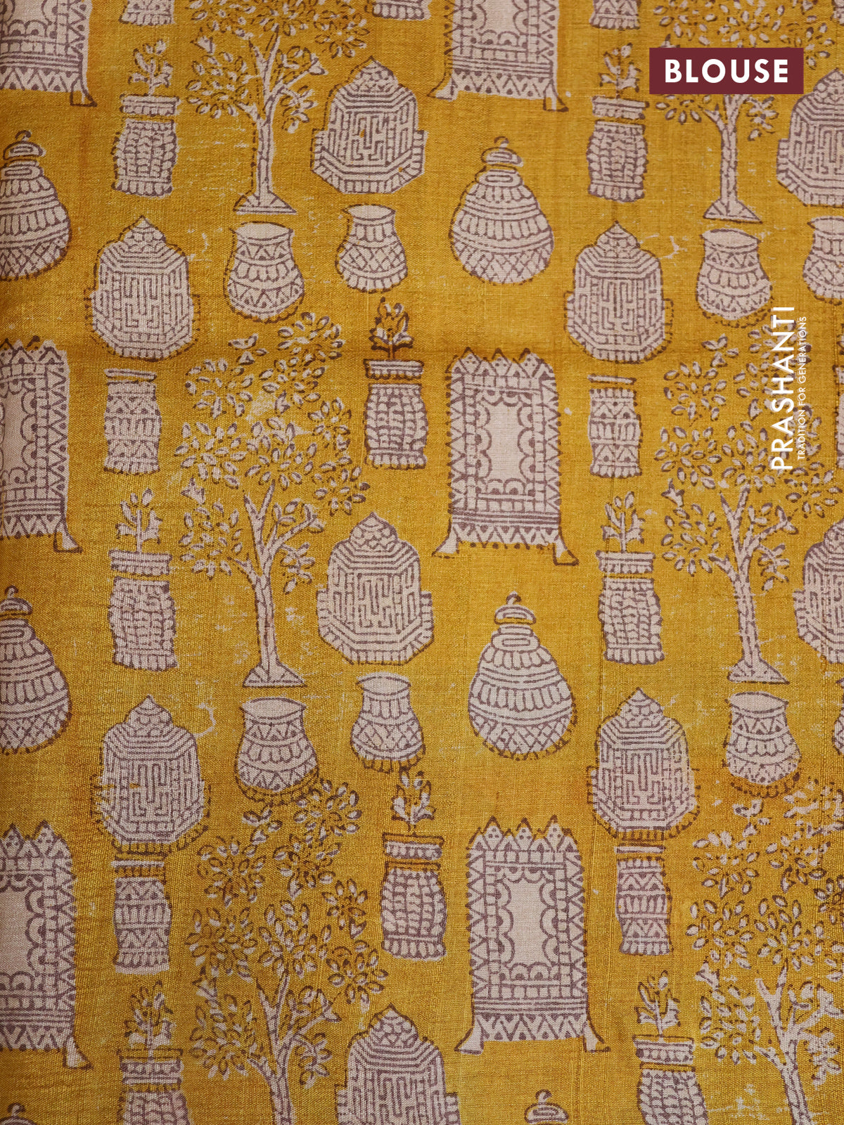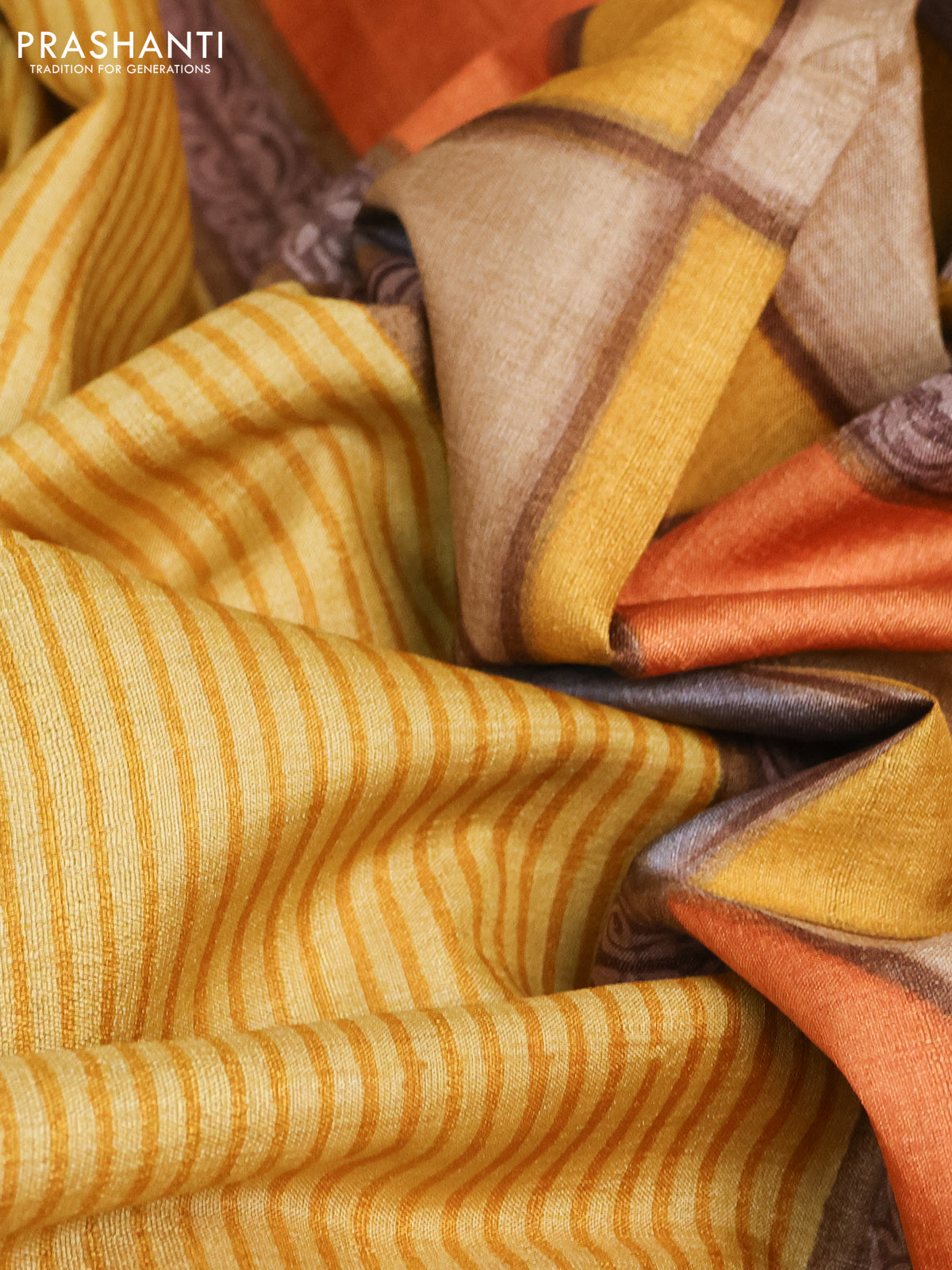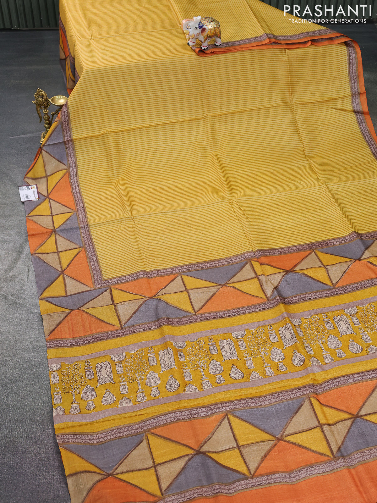 Pure tussar silk saree mustard yellow and multi colour with allover stripes pattern and printed border