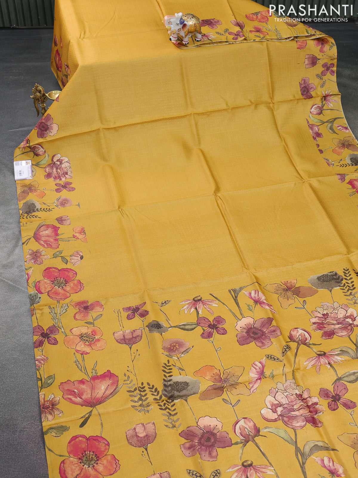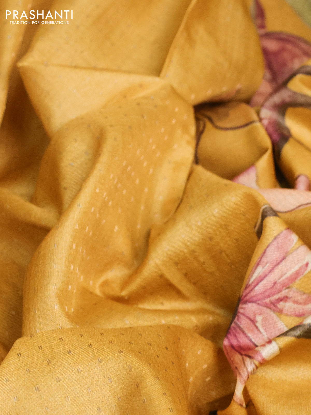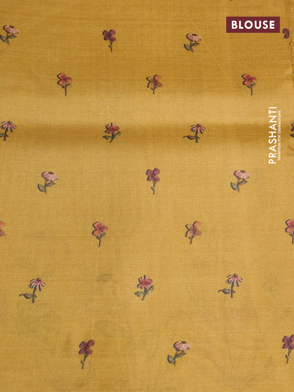 Pure tussar silk saree mustard yellow with allover zari weaves and floral digital printed border
