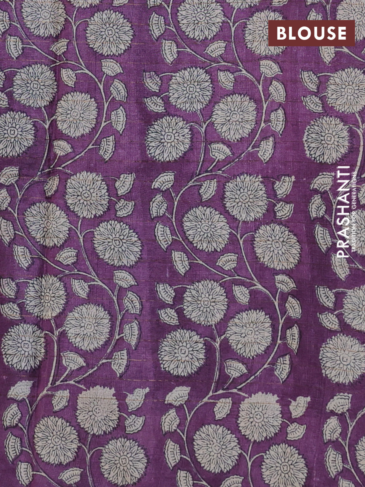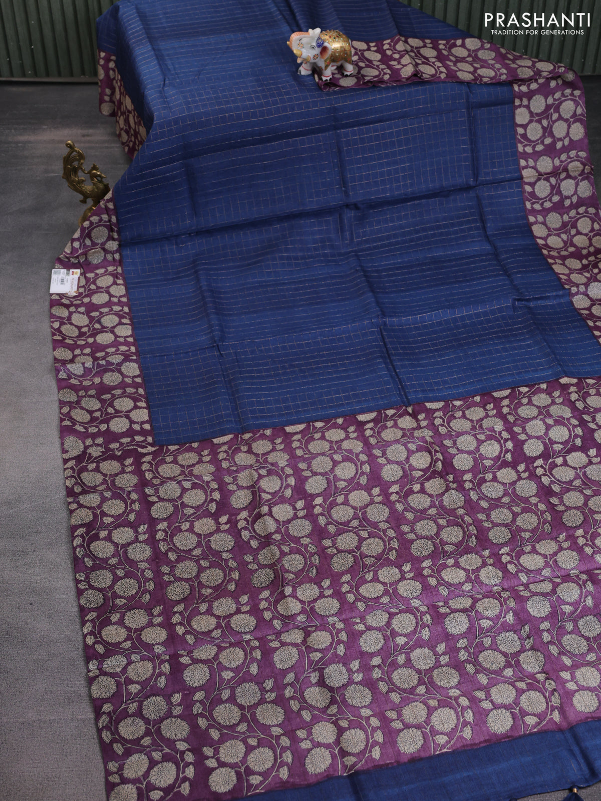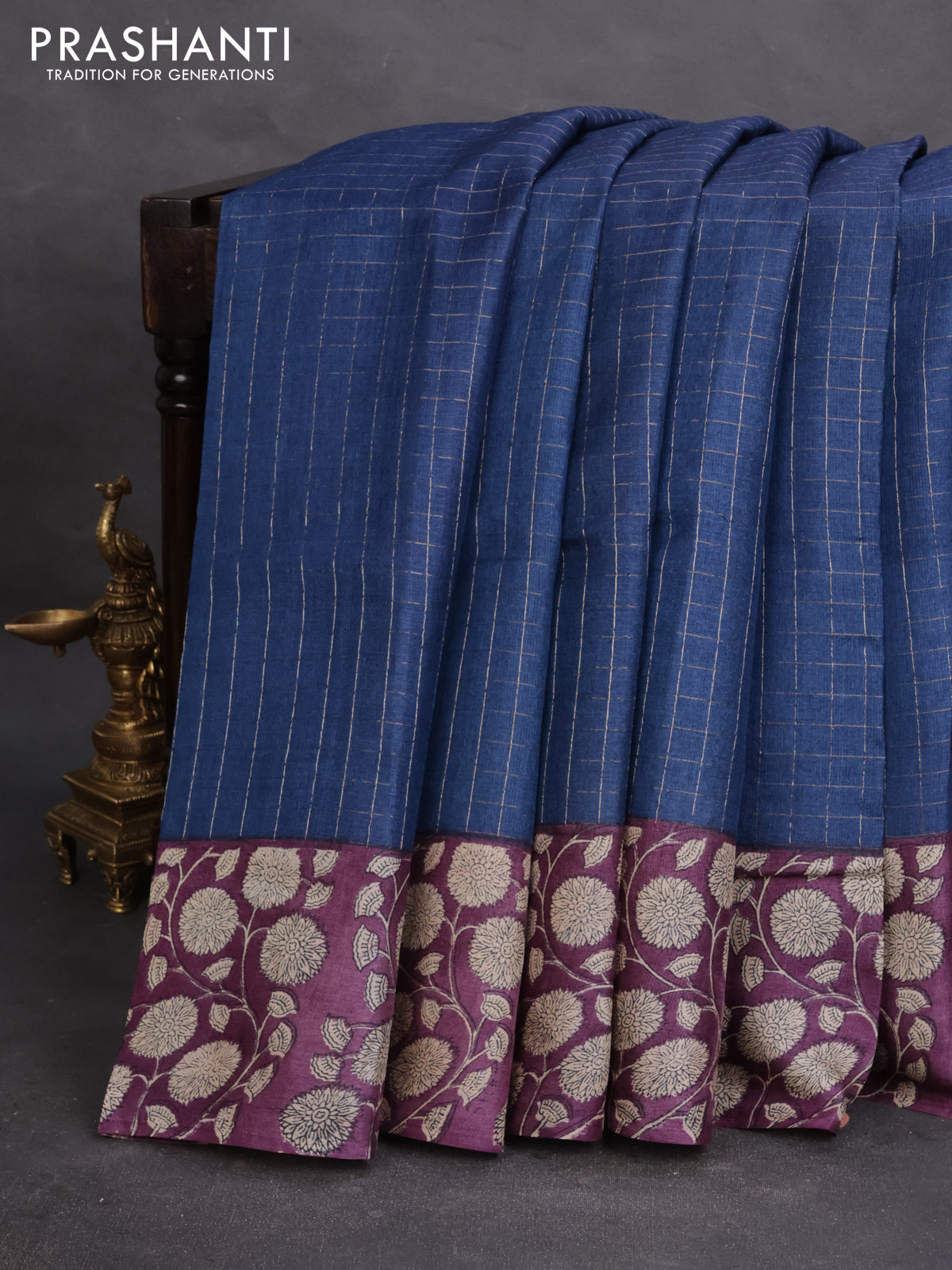 Pure tussar silk saree navy blue and wine shade with allover zari checked pattern and floral printed border