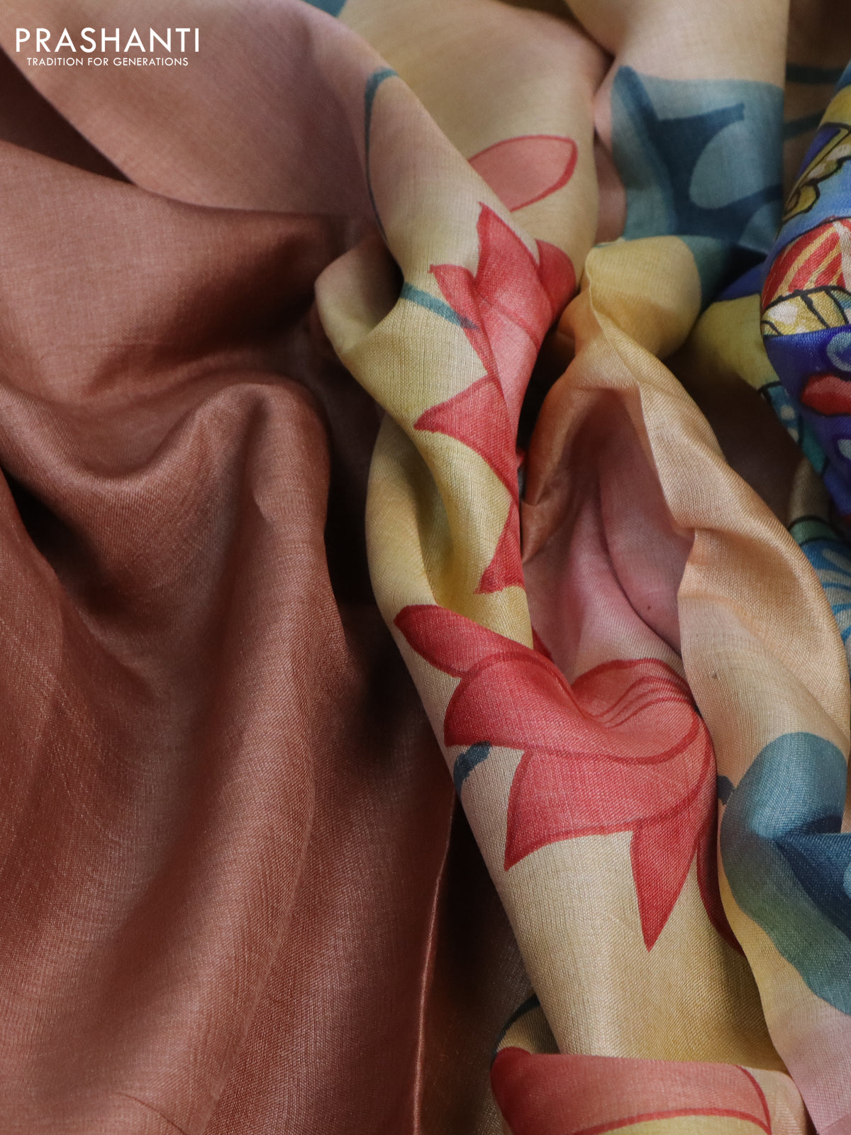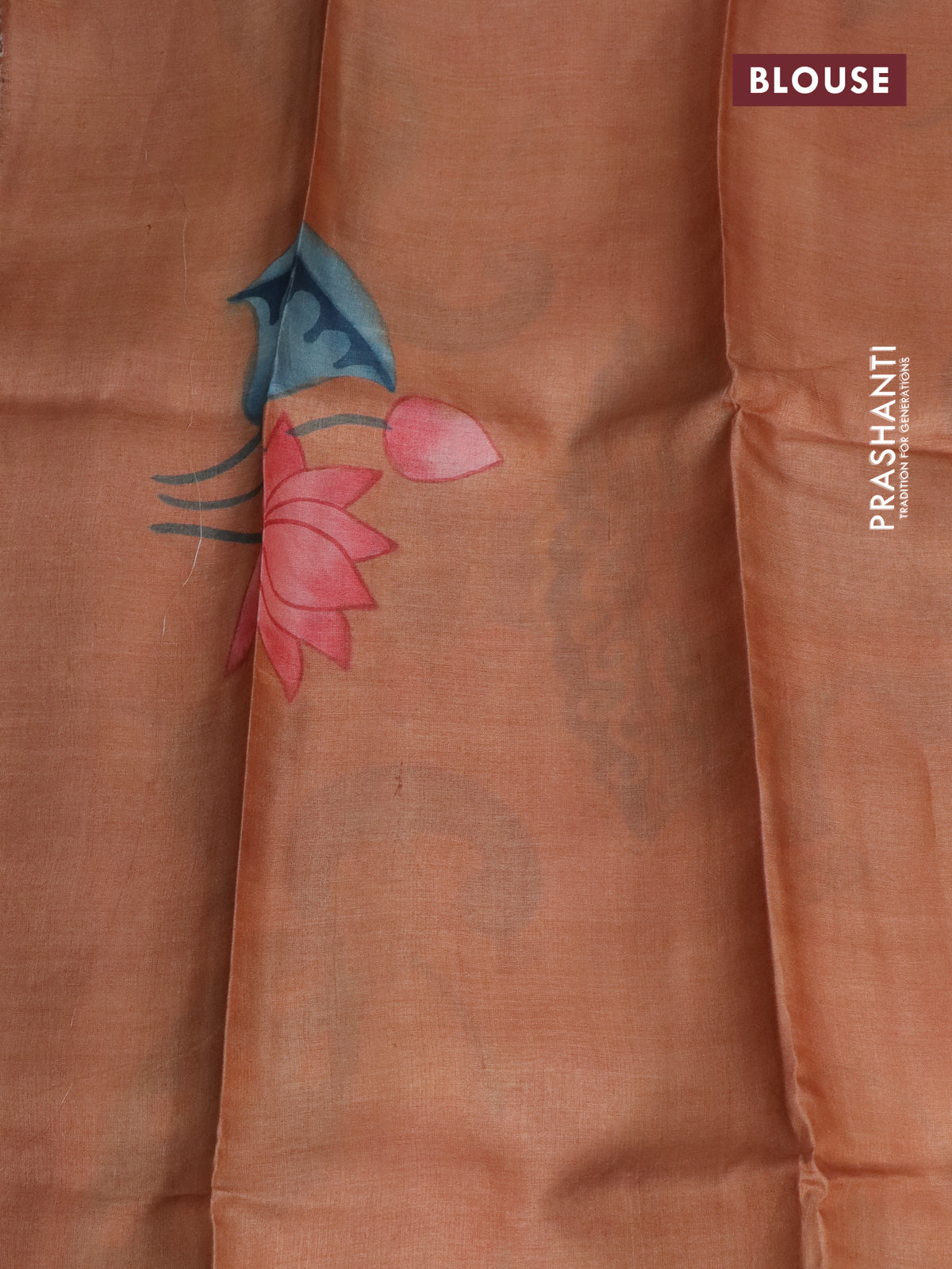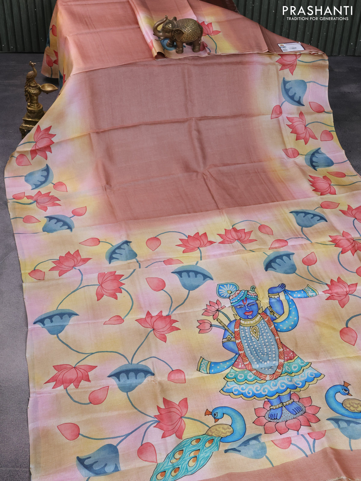 Pure tussar silk saree pastel brown and peach shade with plain body and pichwai hand painted pallu & border