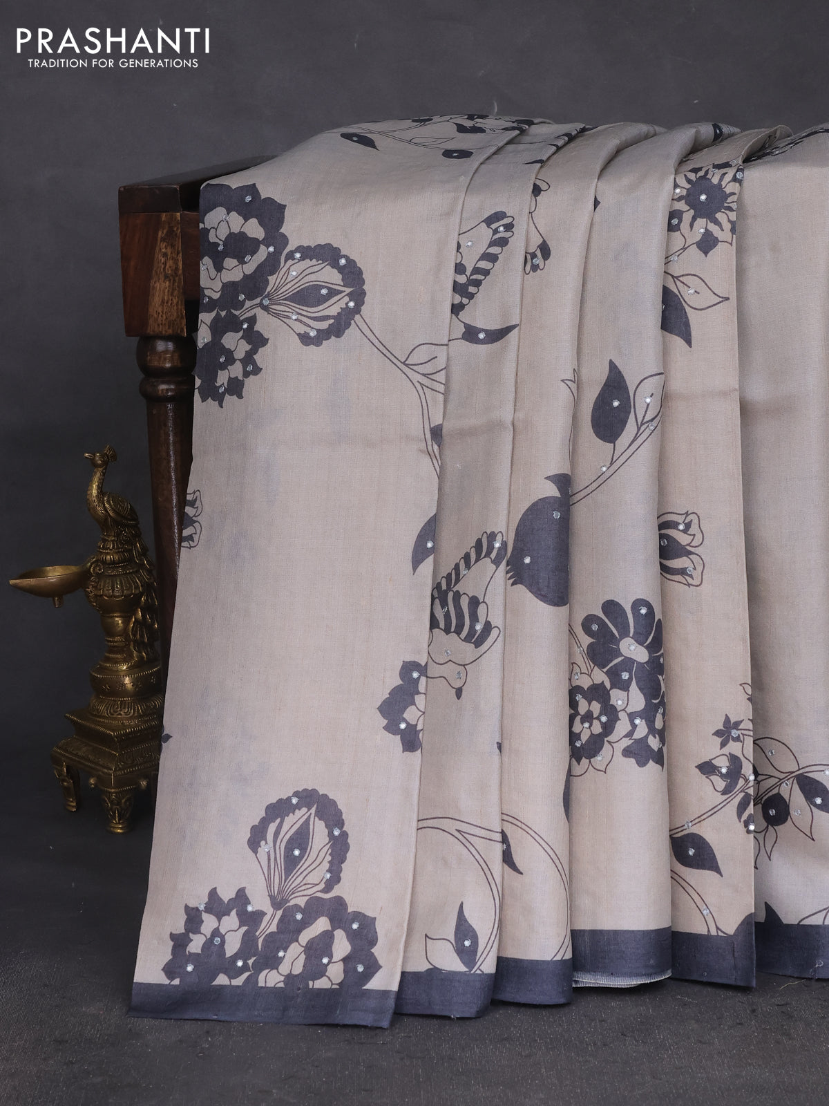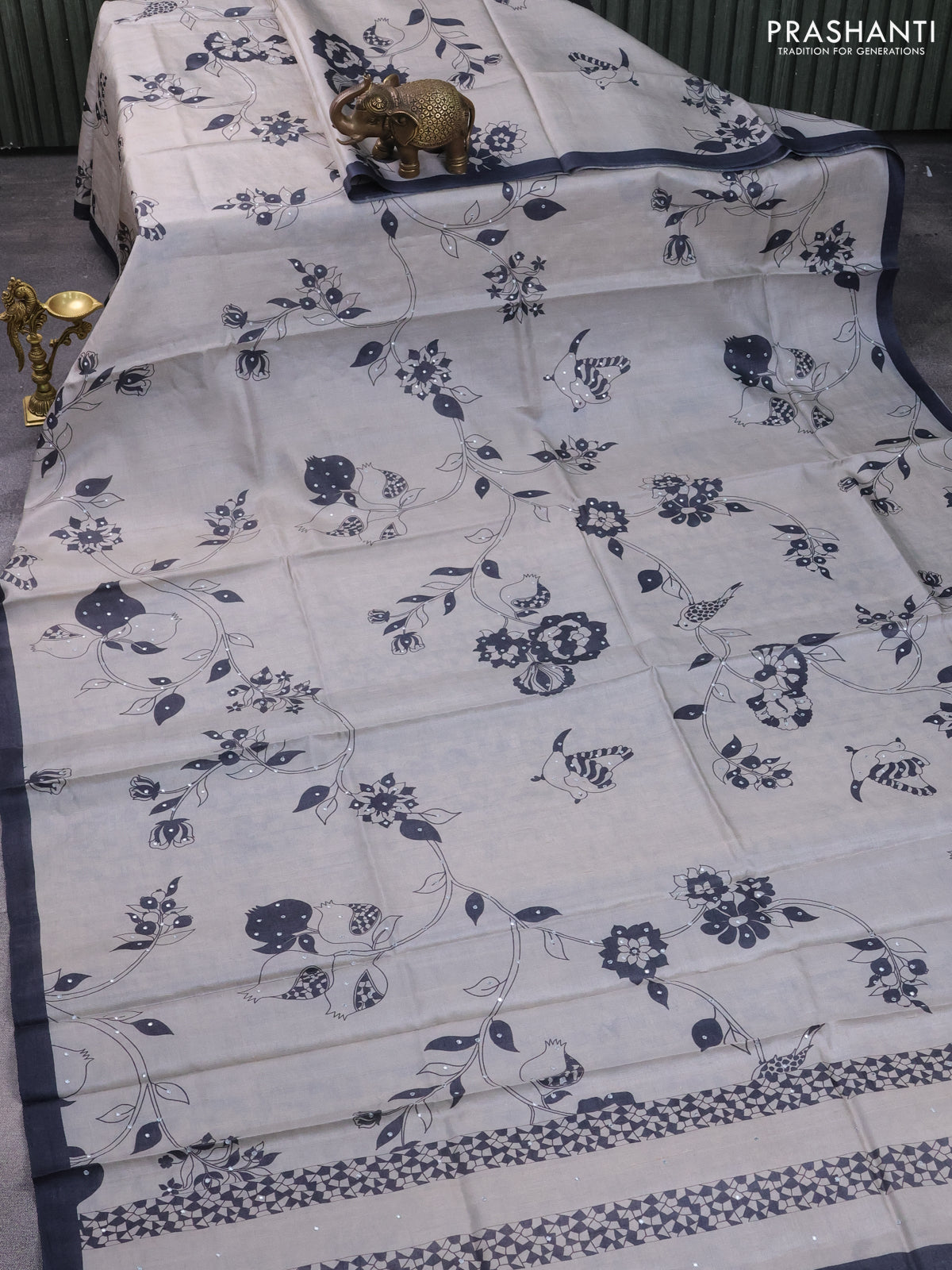 Pure tussar silk saree pastel grey and elephant grey with allover prints & mirror work and piping border