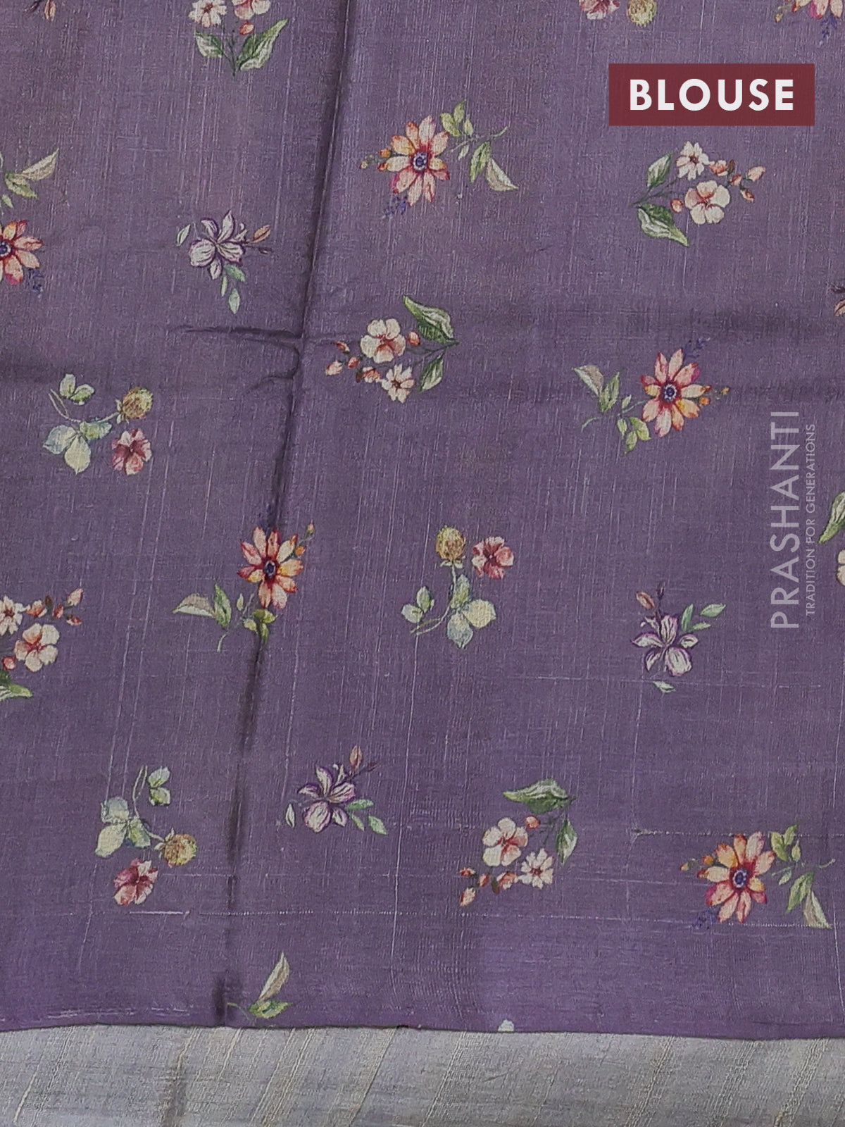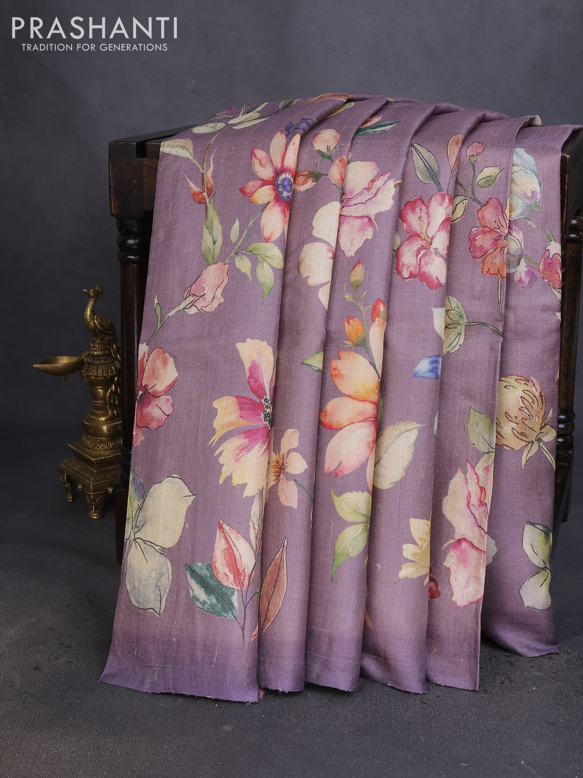Pure tussar silk saree pastel lavender with allover floral digital prints in borderless style