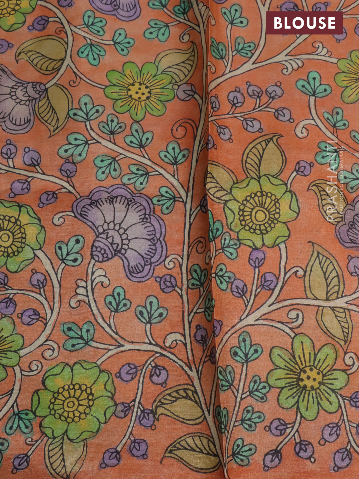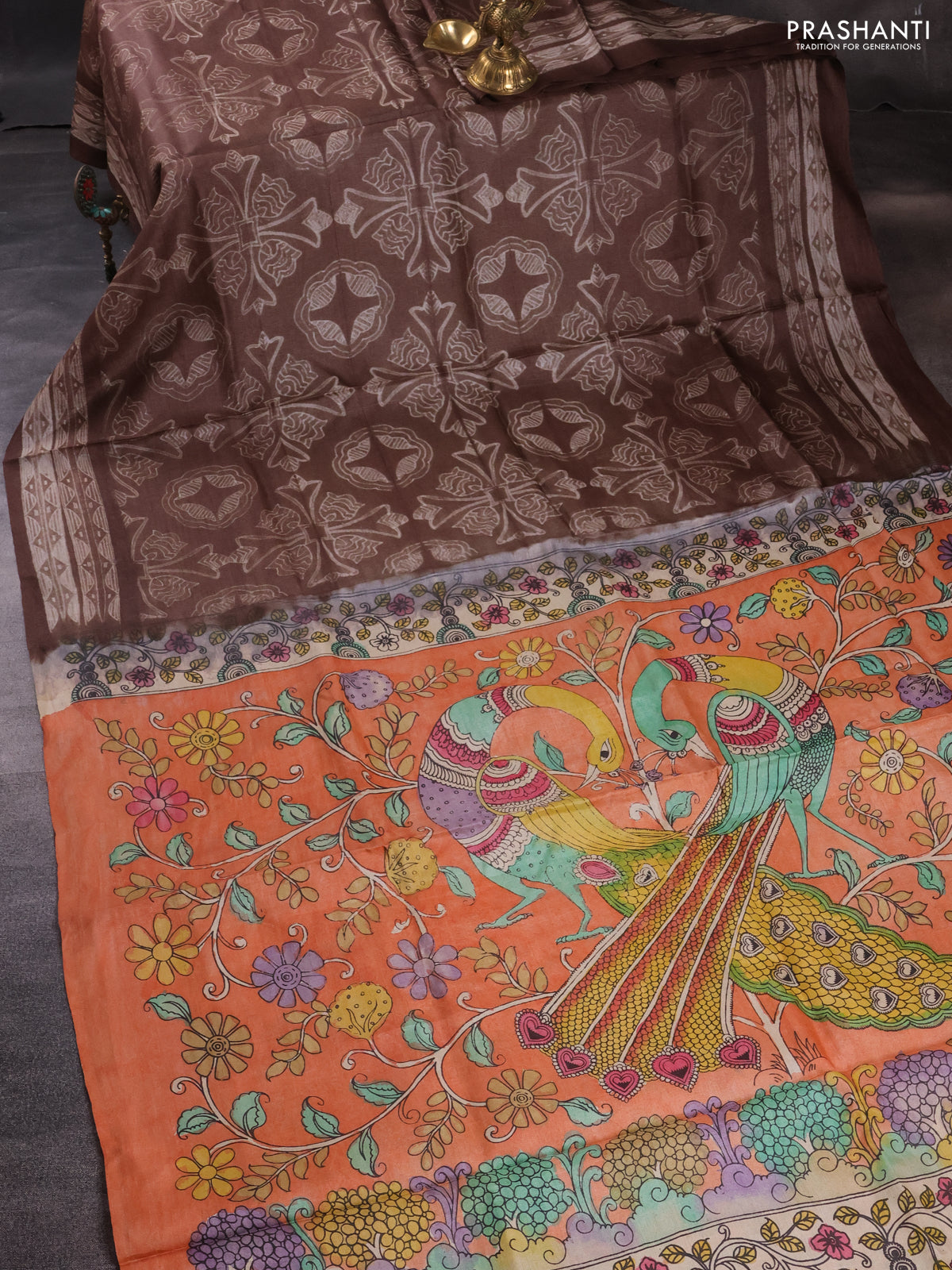 Pure tussar silk saree peach orange and brown with allover pen kalamkari prints in borderless style