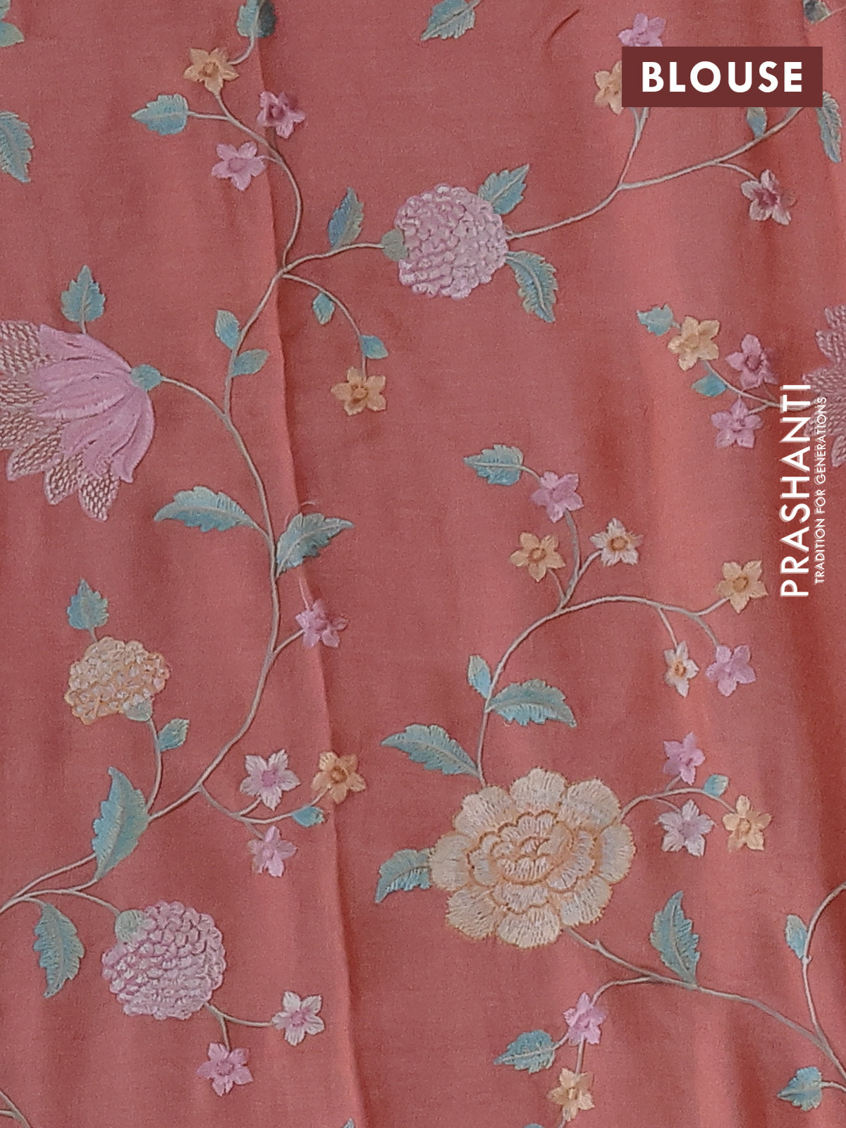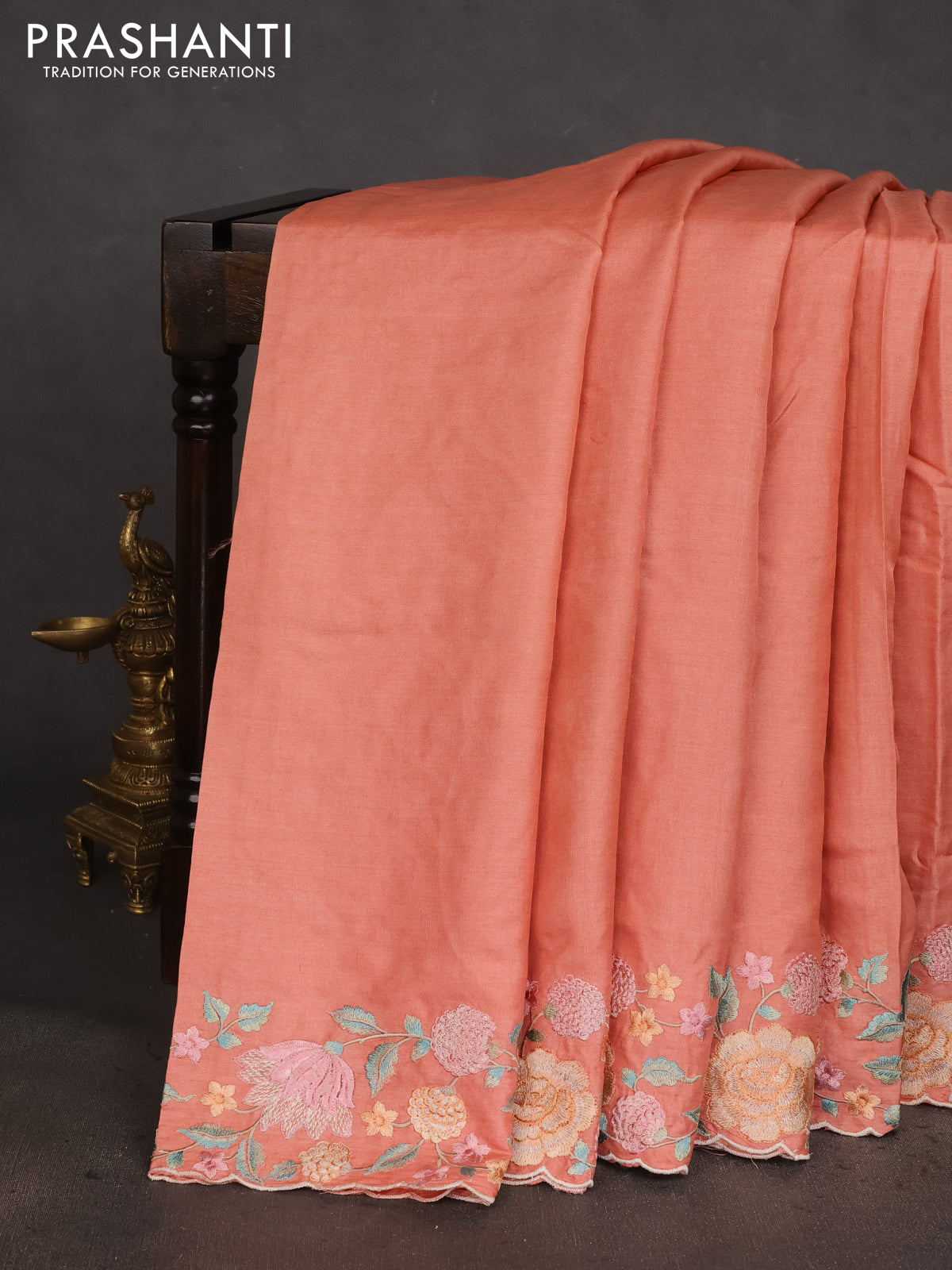 Pure tussar silk saree peach orange with plain body and floral design embroidery work border