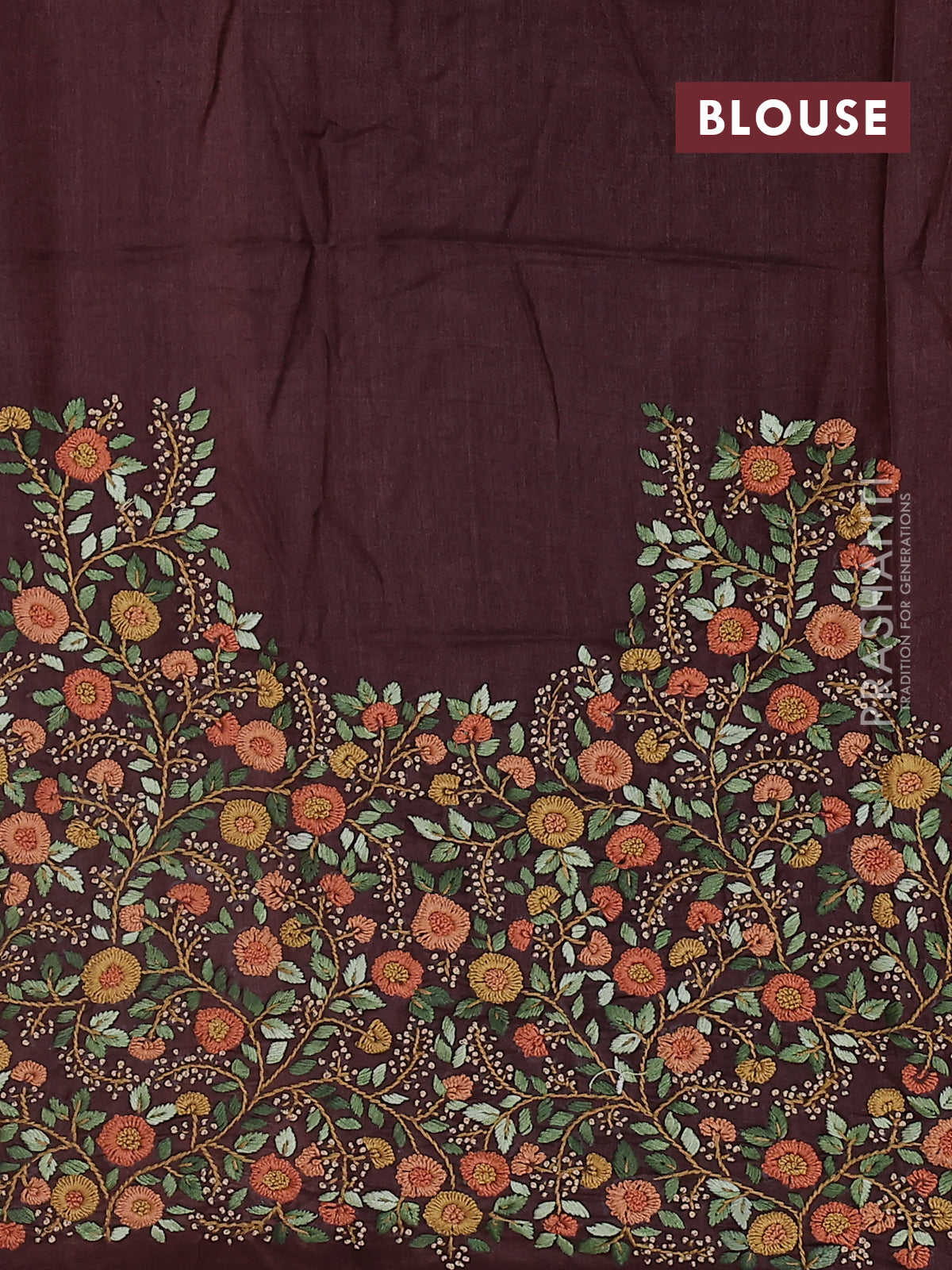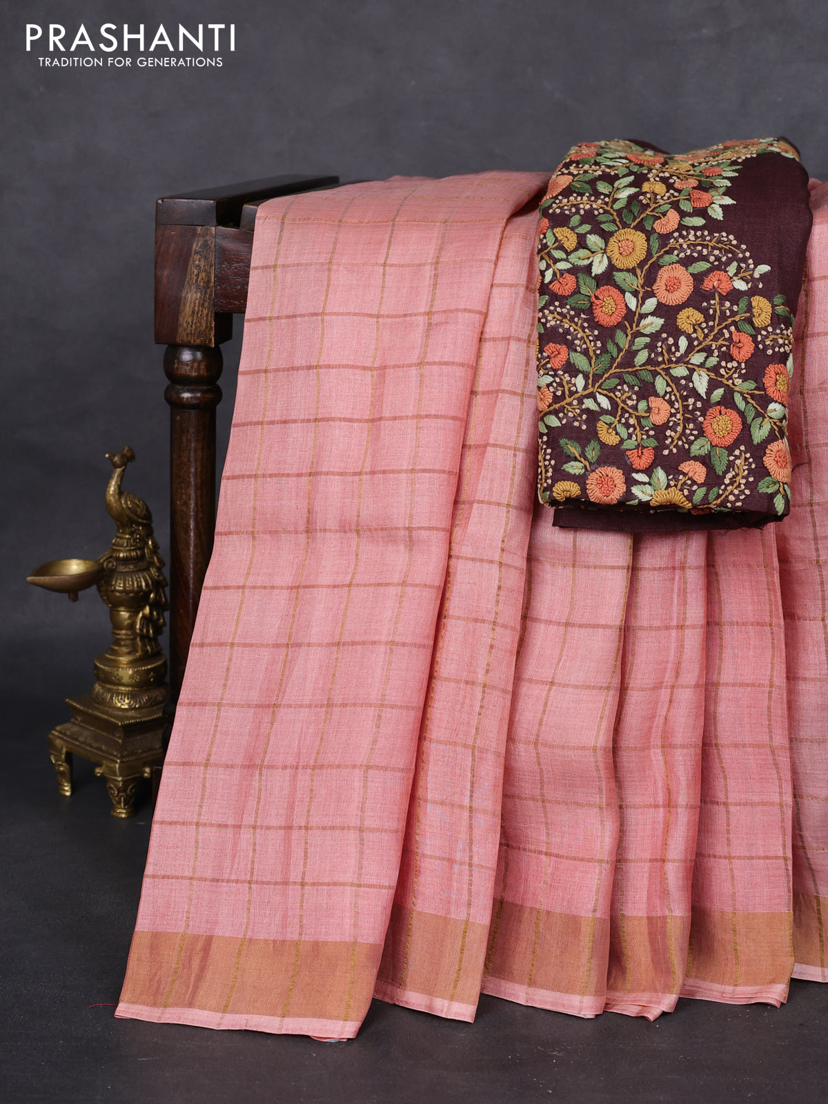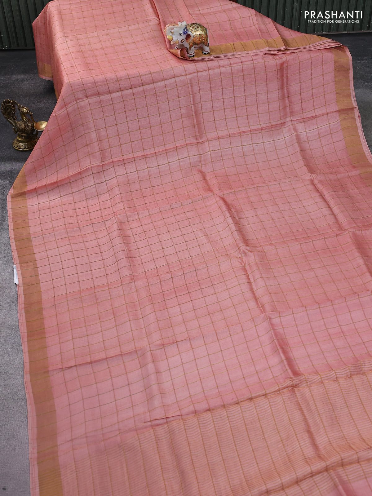 Pure tussar silk saree peach pink and coffee brown with allover zari checked pattern and zari woven border