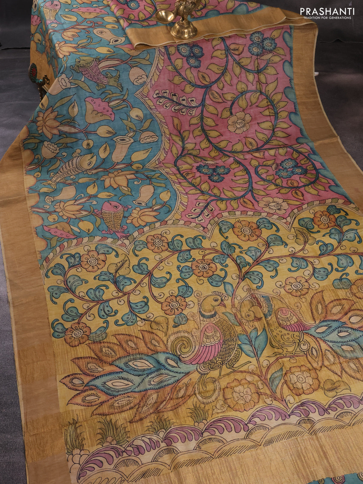Pure tussar silk saree peach pink and mustard shade with allover pen kalamkari prints and zari woven border