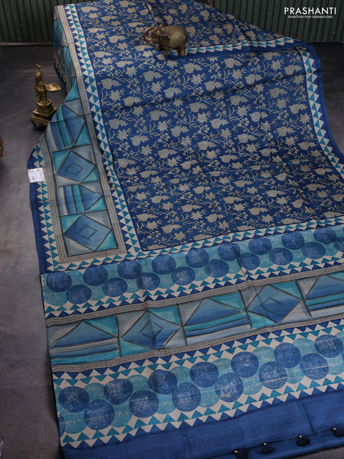 Pure tussar silk saree peacock blue with allover kalamkari prints and printed border
