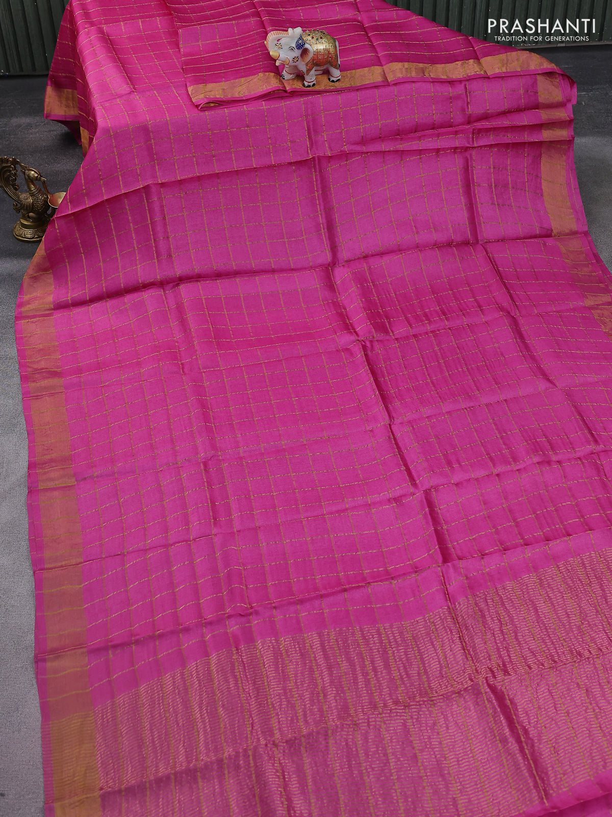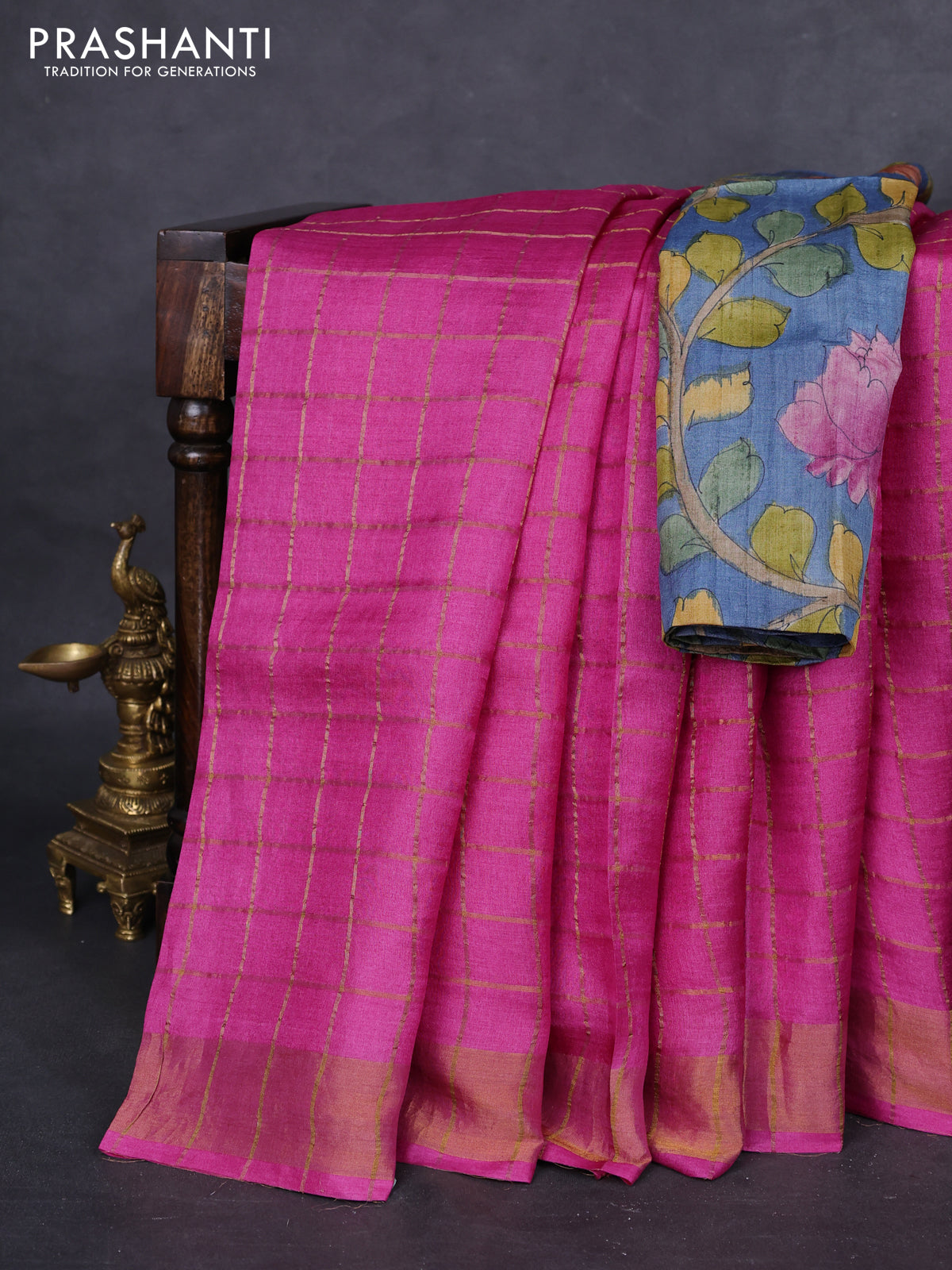 Pure tussar silk saree pink and blue shade with allover zari checked pattern and zari woven border