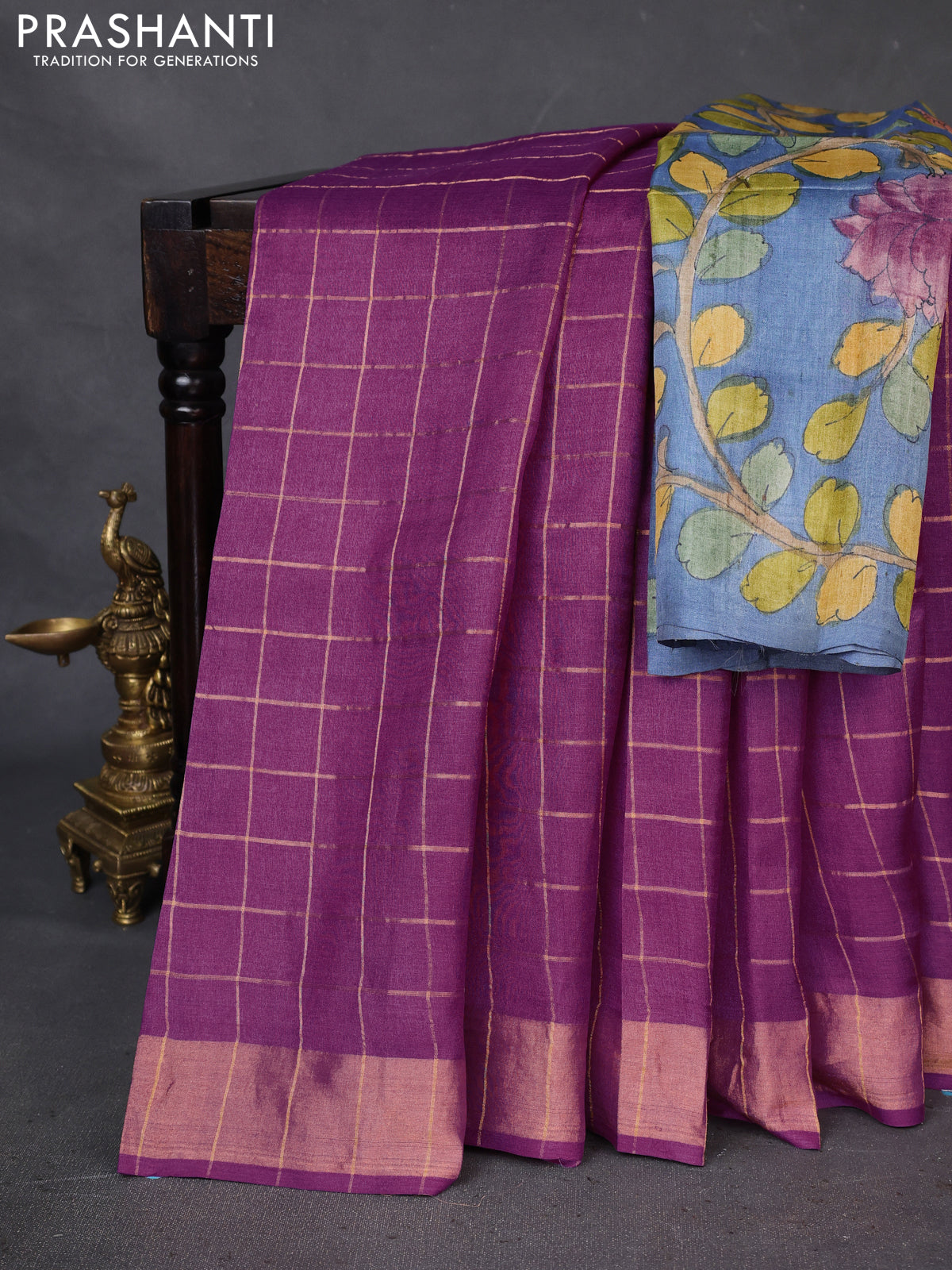 Pure Tussar Silk Saree purple and bluish grey with allover zari checked pattern and zari woven border