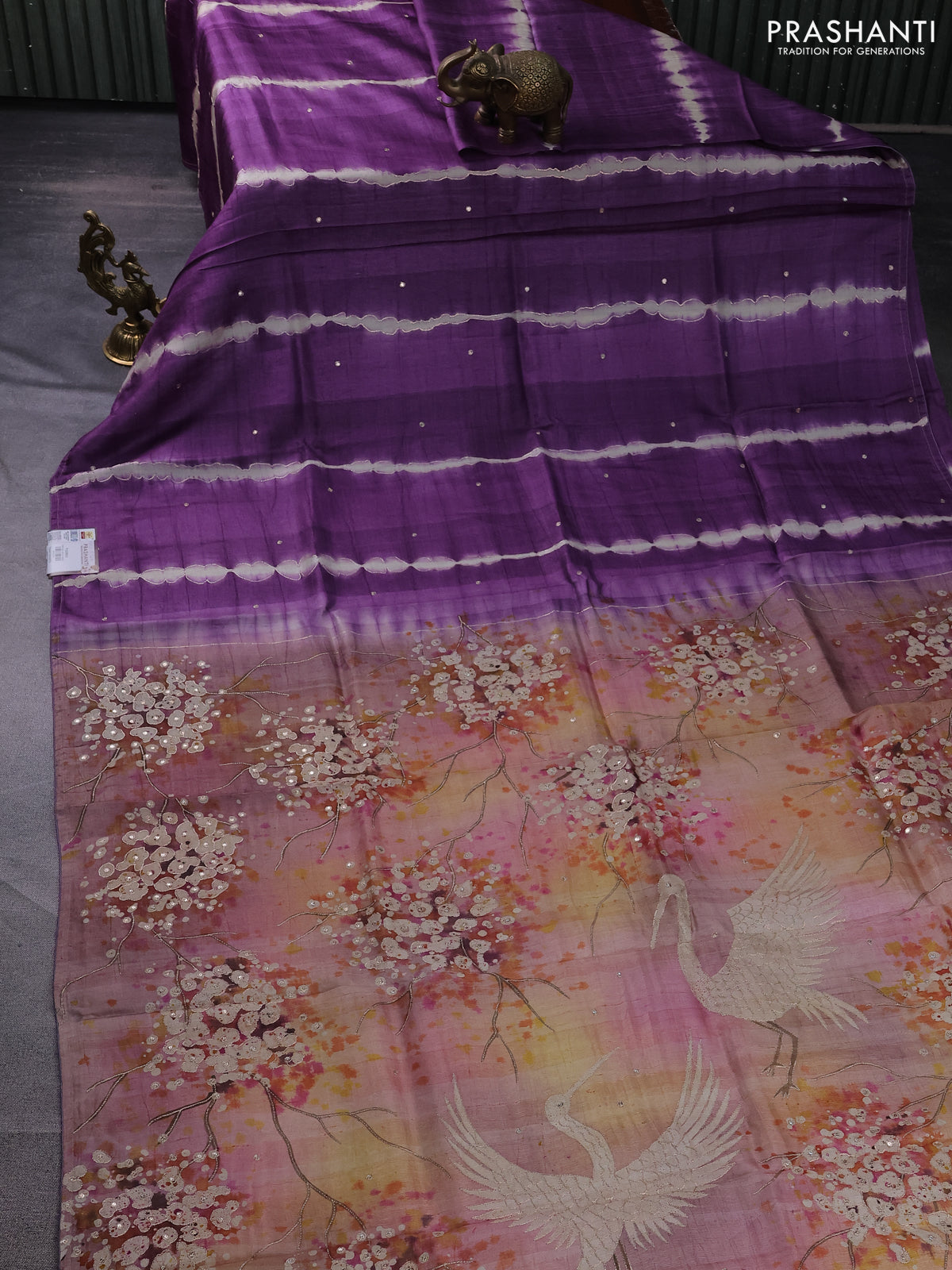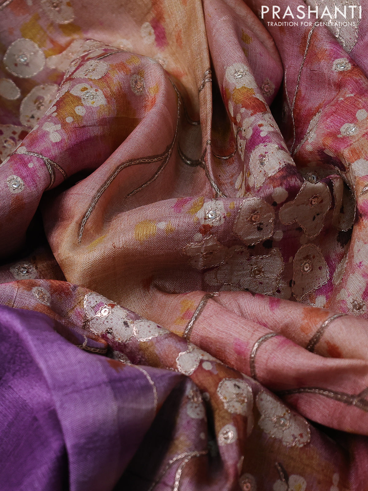 Pure tussar silk saree purple and multi colour with tie & dye prints & pita work and embroidery pallu
