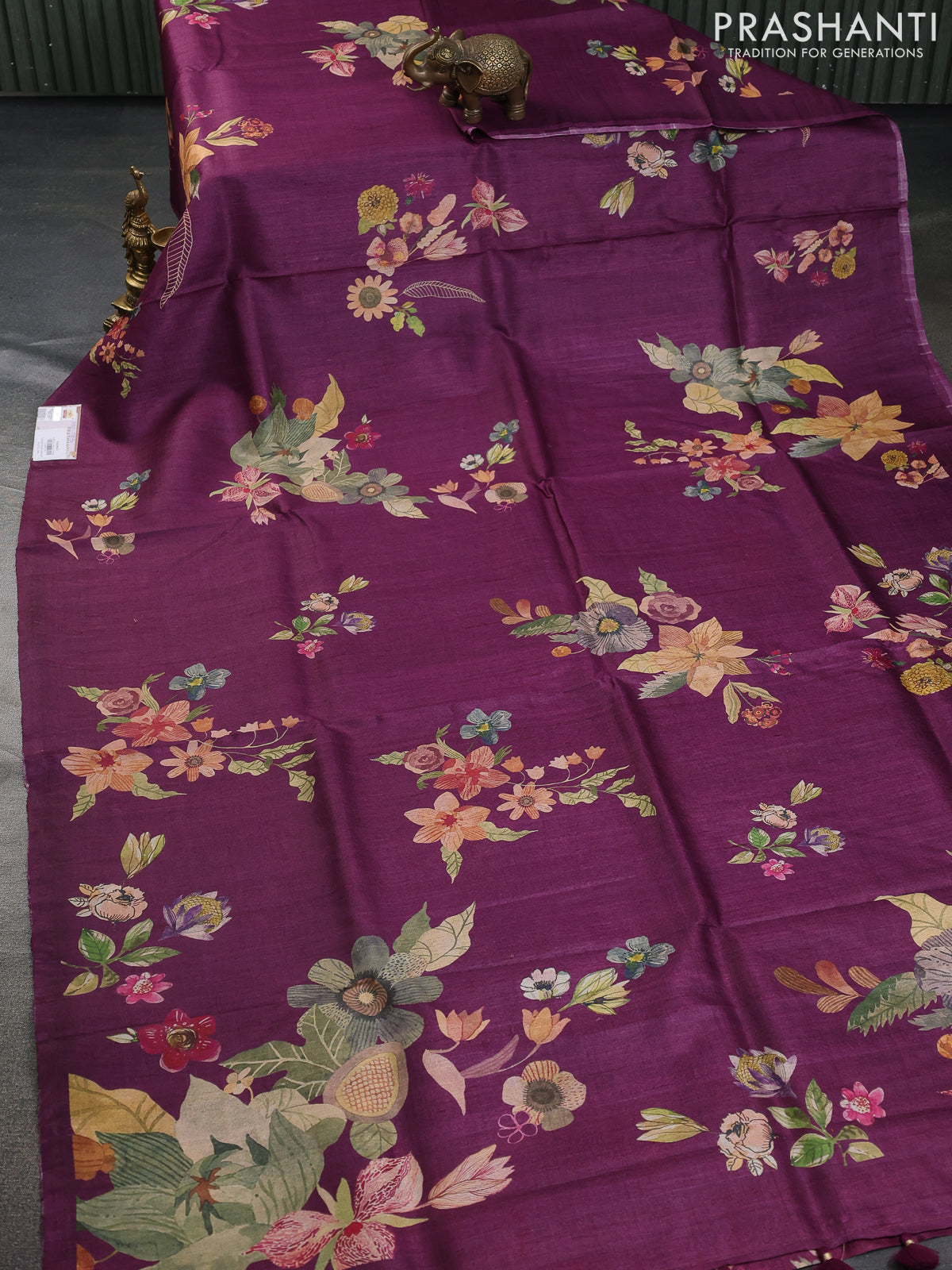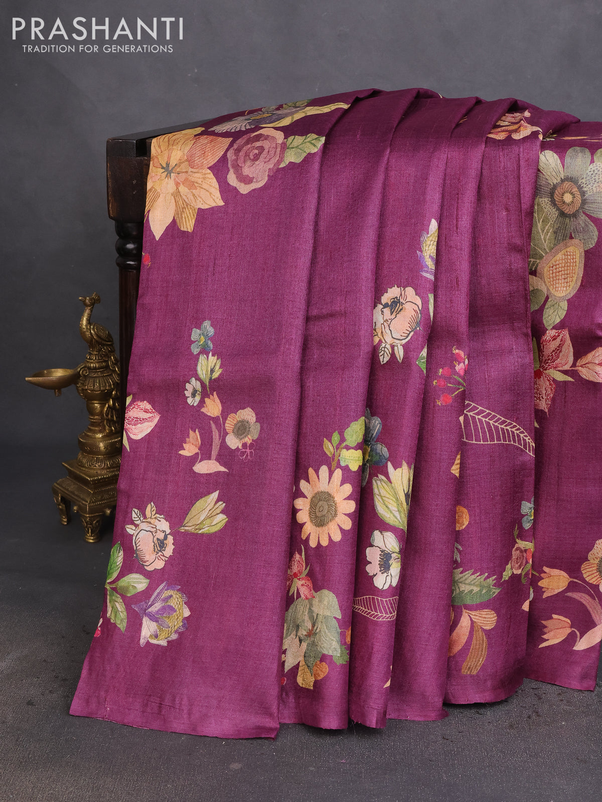 Pure tussar silk saree purple with allover floral digital prints in borderless style