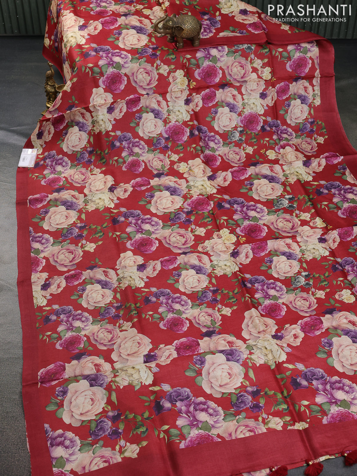 Pure tussar silk saree red with allover floral digital prints in borderless style