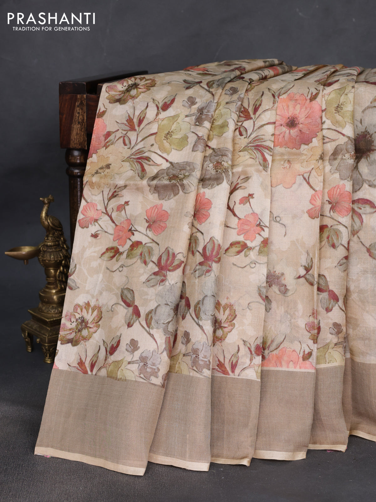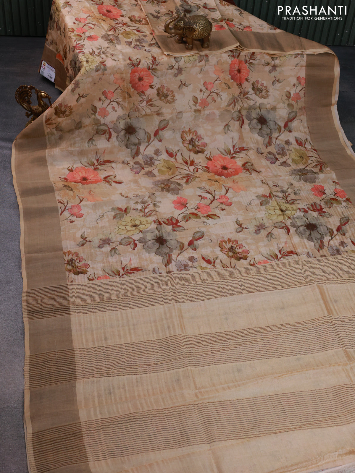 Pure tussar silk saree sandal with floral digital prints and zari woven border