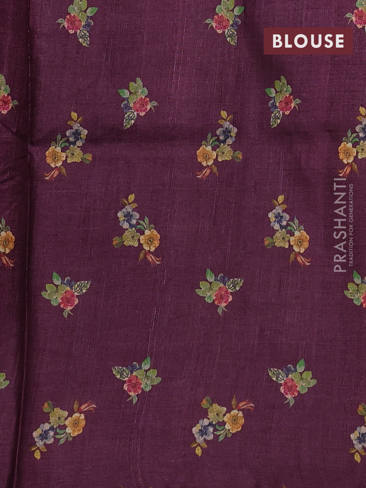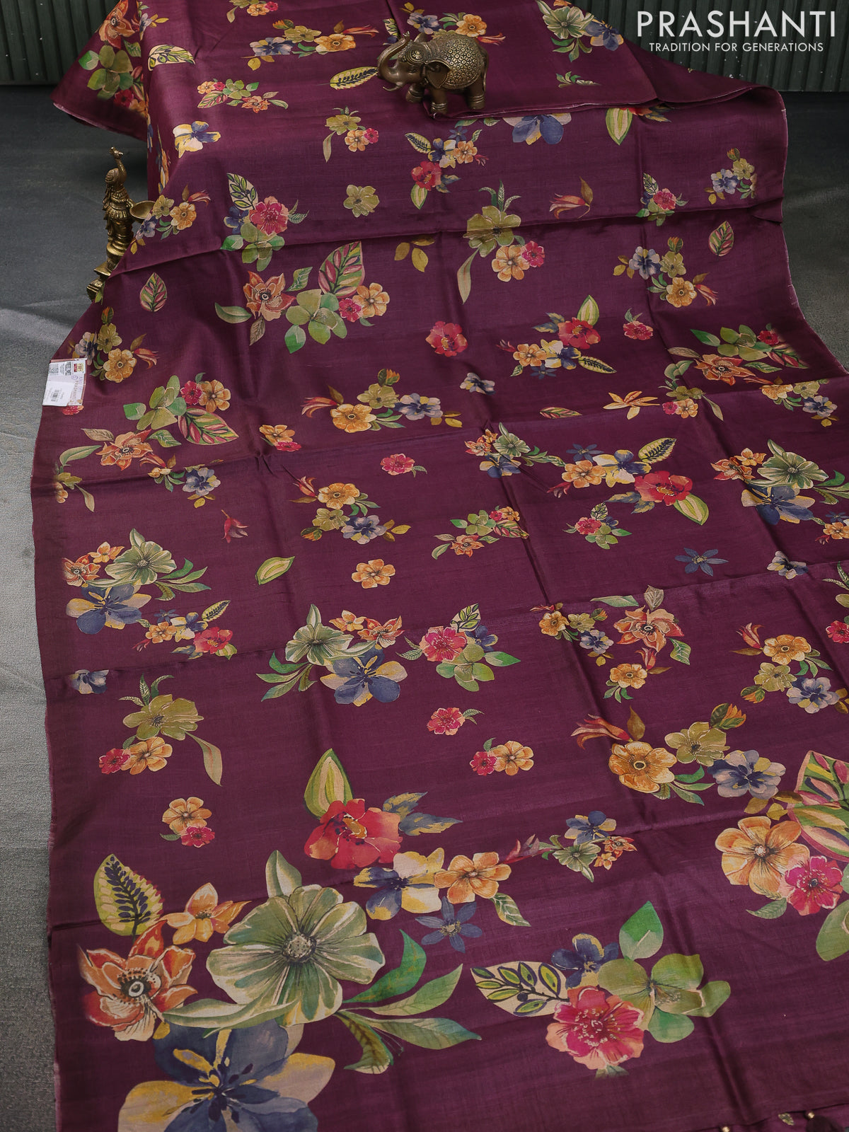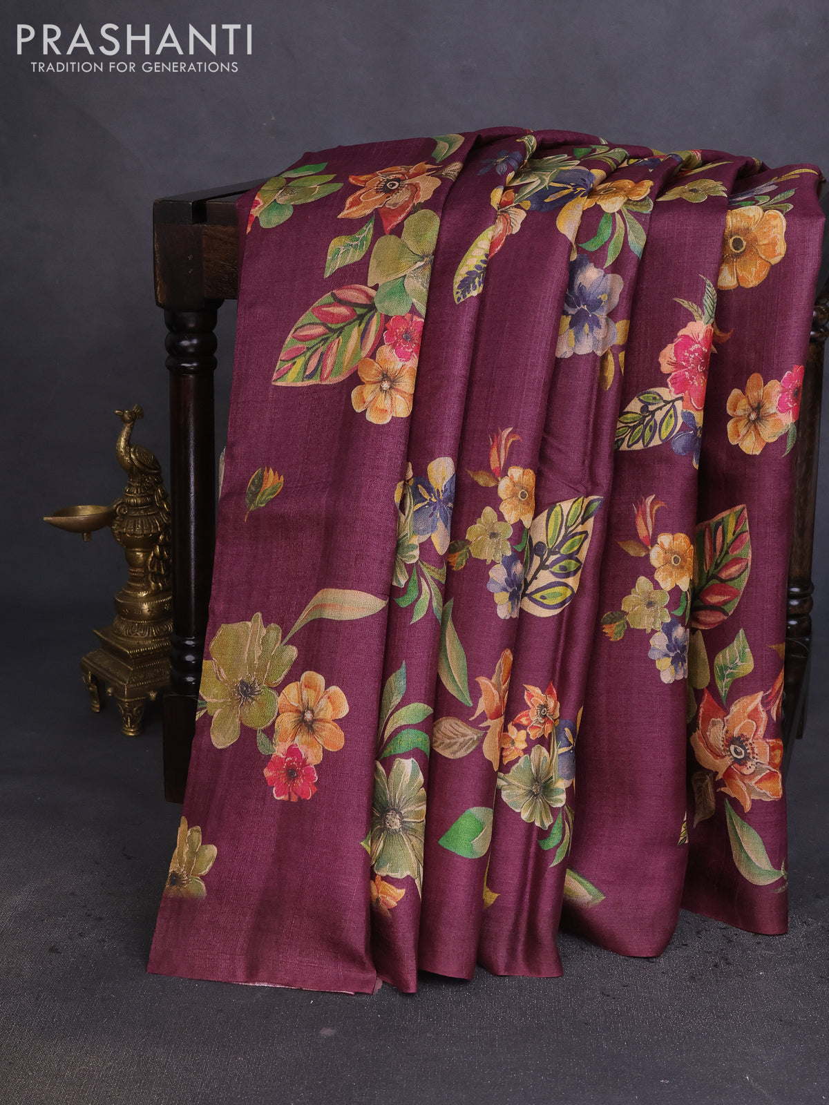 Pure tussar silk saree wine shade with allover floral digital prints in borderless style