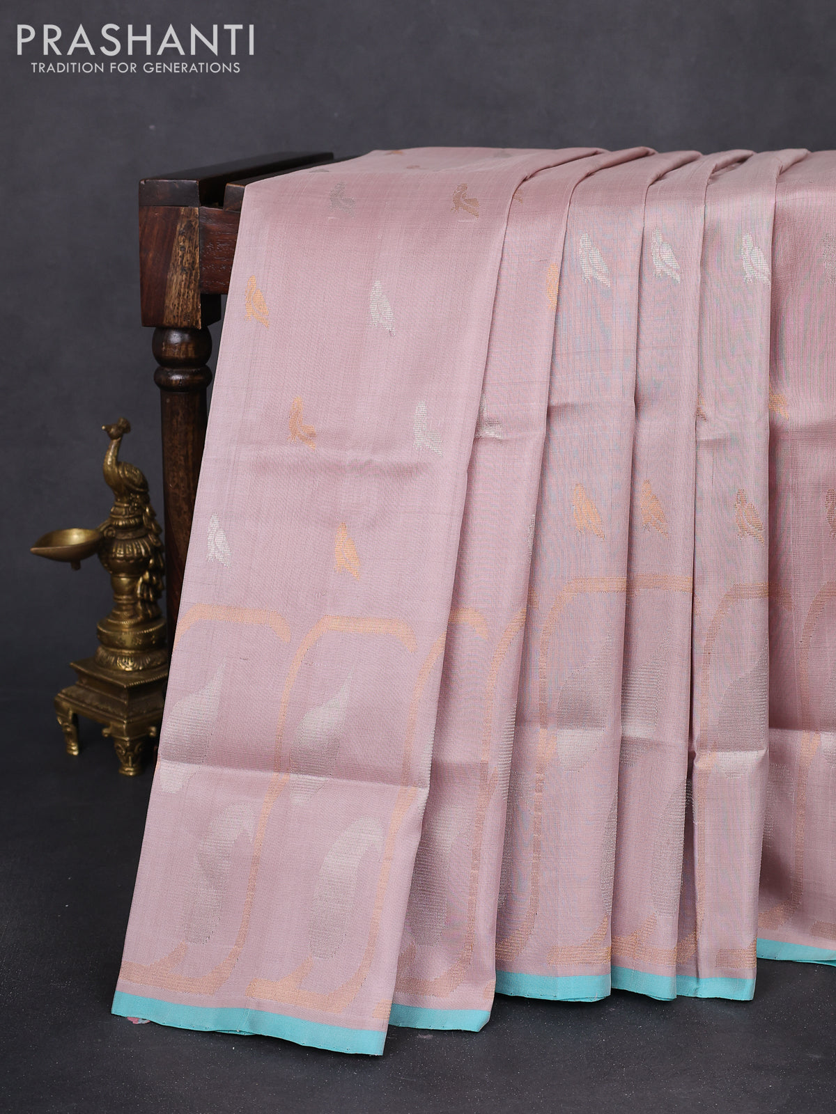 Pure uppada silk saree beige and teal blue with silver & gold zari woven buttas and long zari woven border