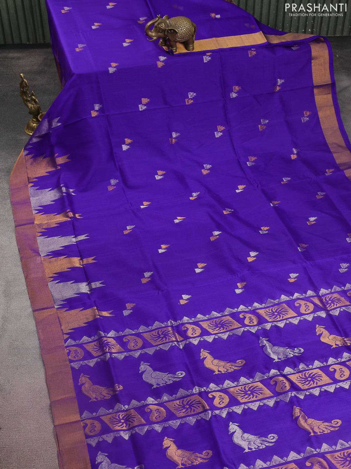 Pure uppada silk saree blue with silver & gold zari woven temple buttas and temple deisgn zari woven border