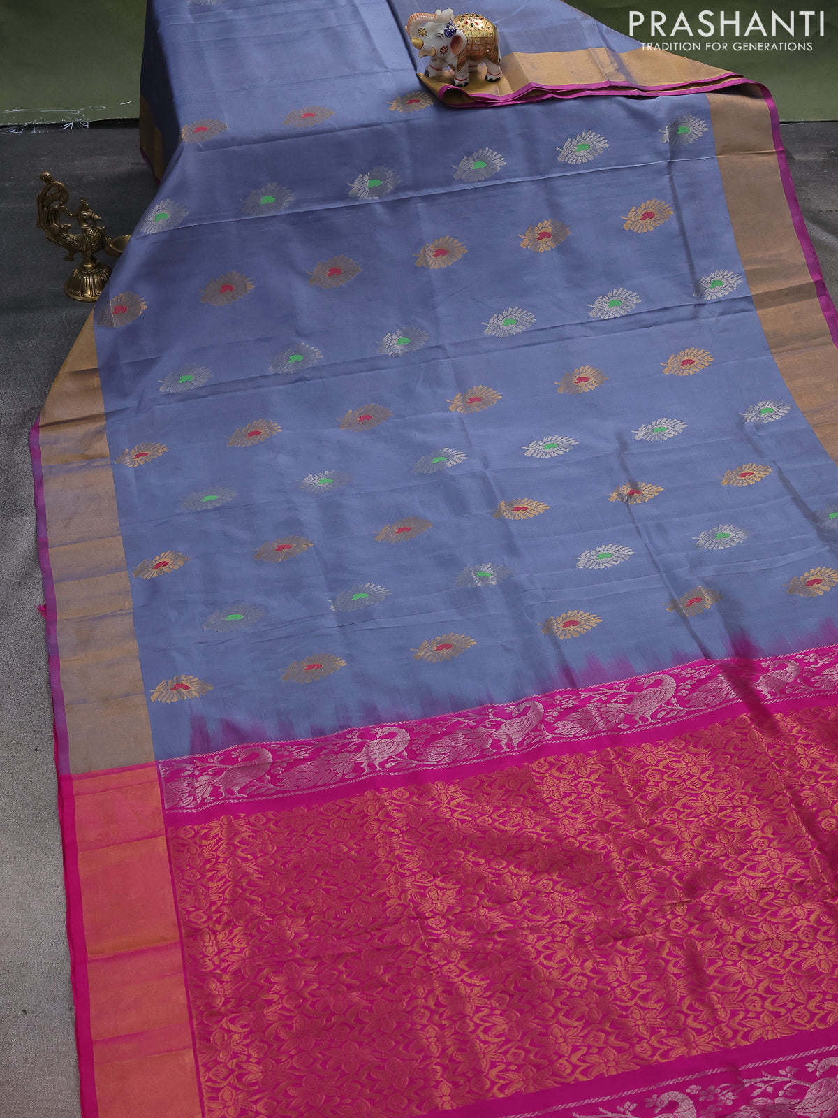 Pure uppada silk saree bluish grey and pink with silver & gold zari woven buttas and zari woven border