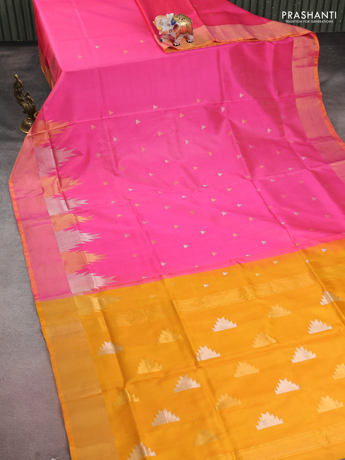 Pure uppada silk saree candy pink and yellow with silver & gold zari woven temple buttas and temple design zari woven border