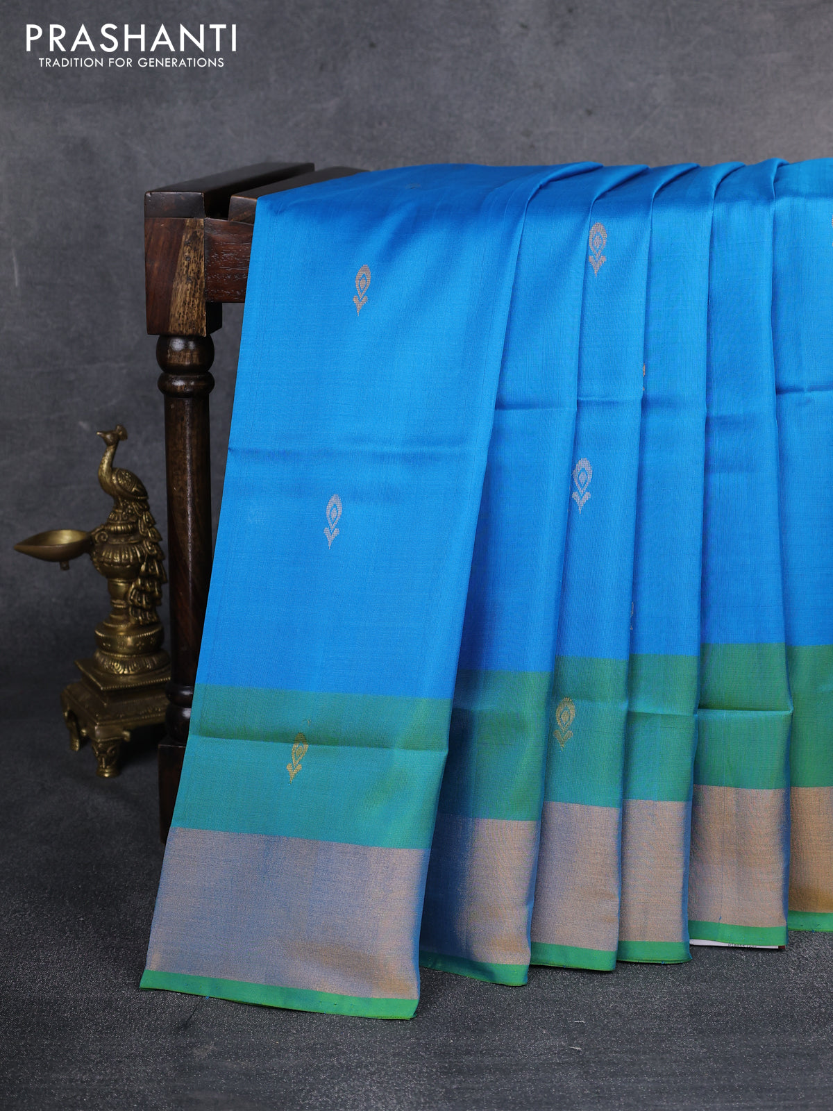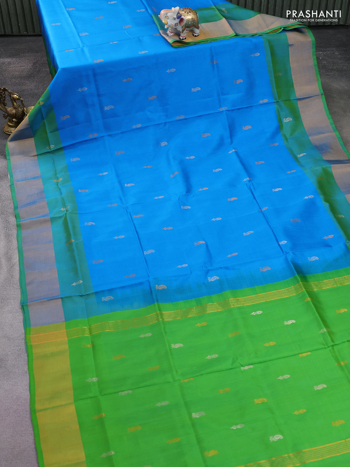 Pure uppada silk saree cs blue and green shade with silver & gold zari woven buttas and zari woven border