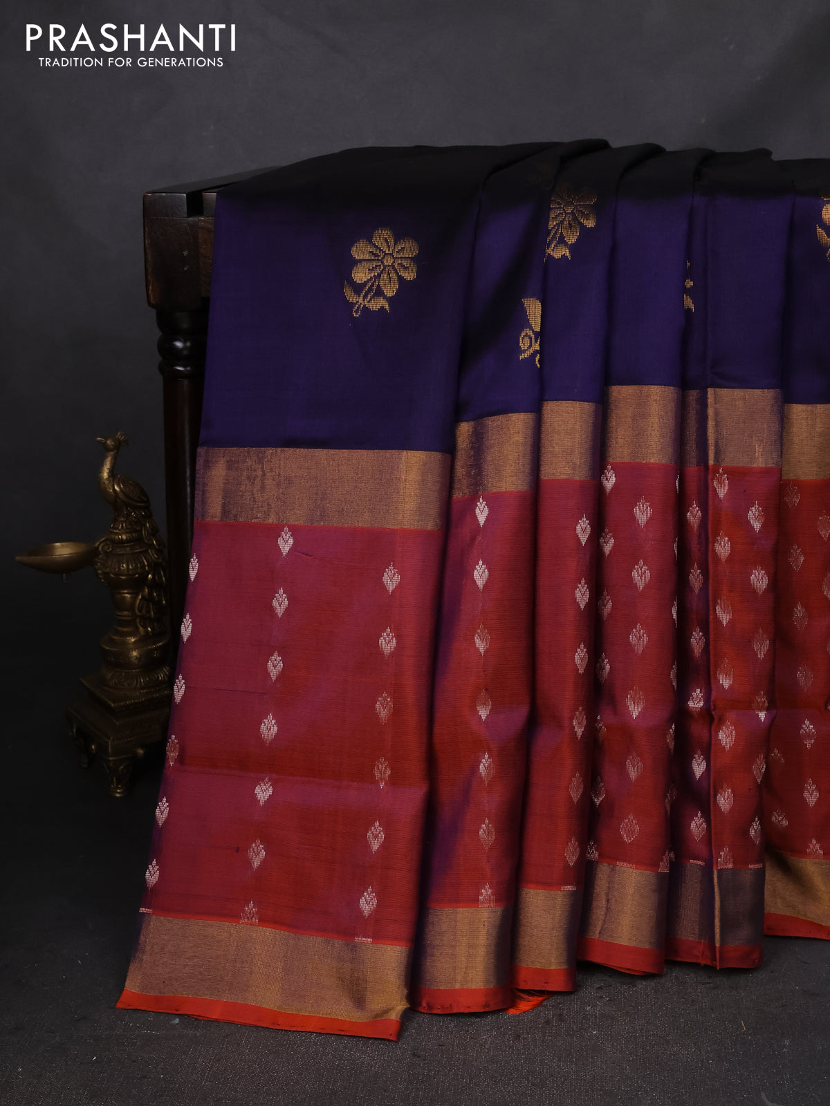 Pure uppada silk saree dark blue and dual shade of rustic orange with zari woven buttas and long zari woven butta border