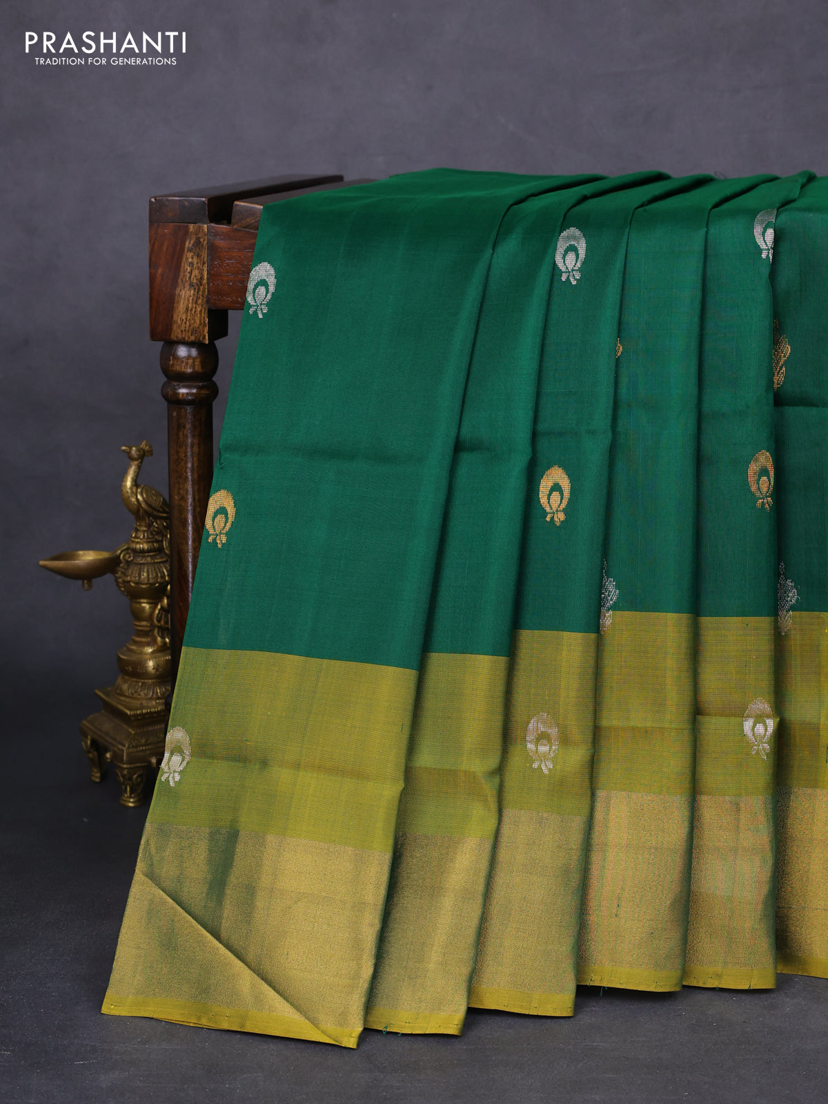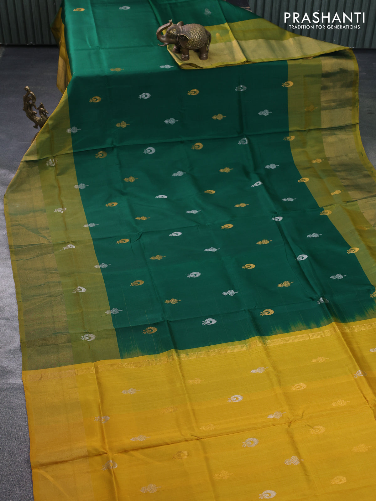Pure uppada silk saree dark green and mustard yellow with silver & gold zari woven buttas and zari woven border