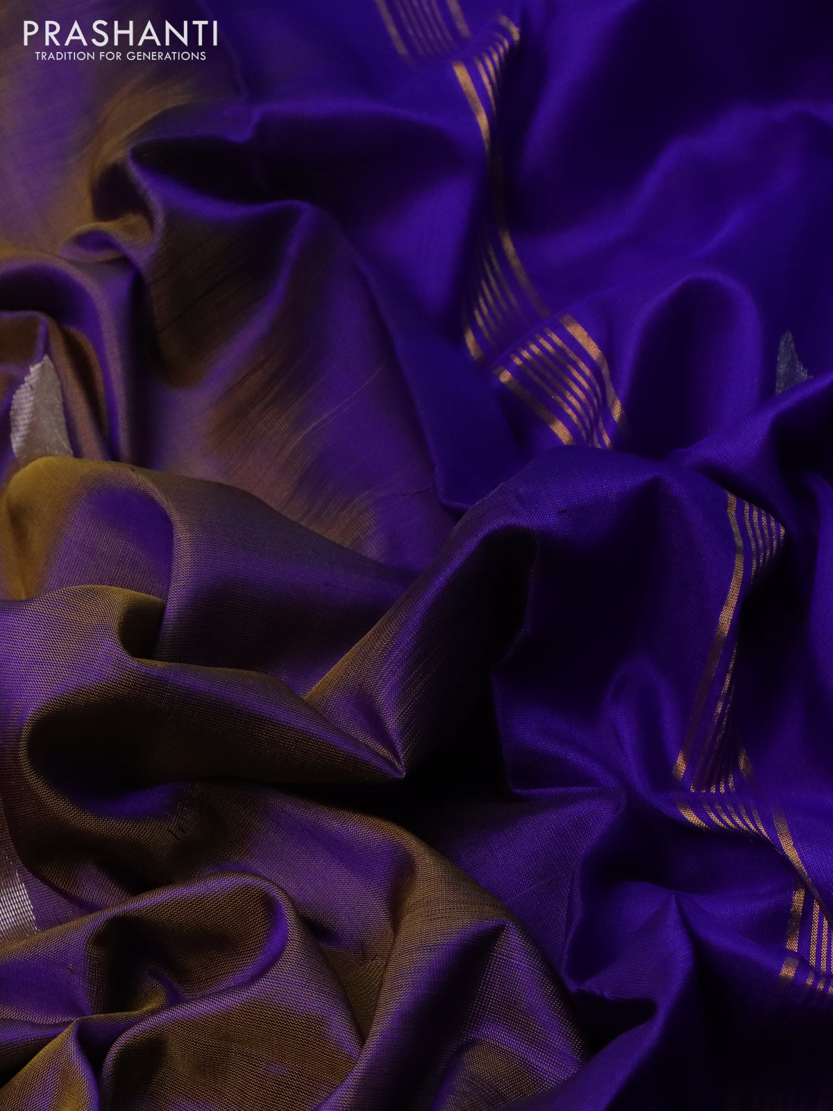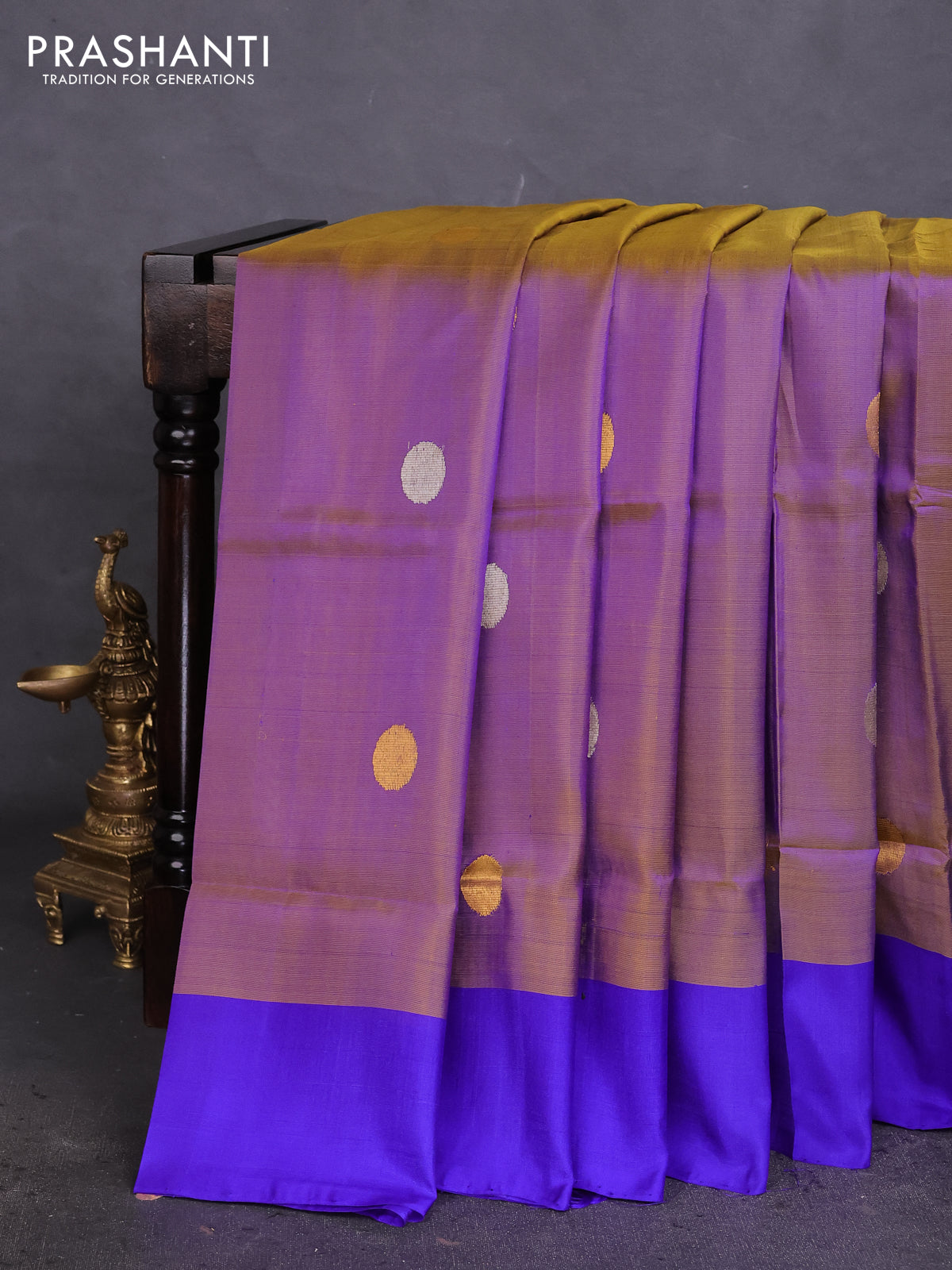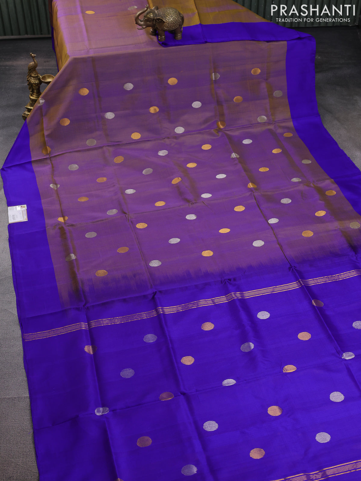 Pure uppada silk saree dual shade of bluish green and blue with silver & gold coin buttas and simple border