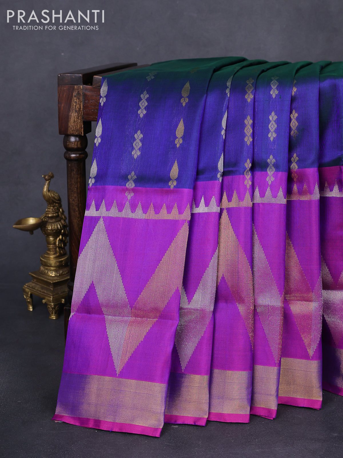 Pure uppada silk saree dual shade of bluish green and purple with allover silver & gold zari buttas and long zari woven border