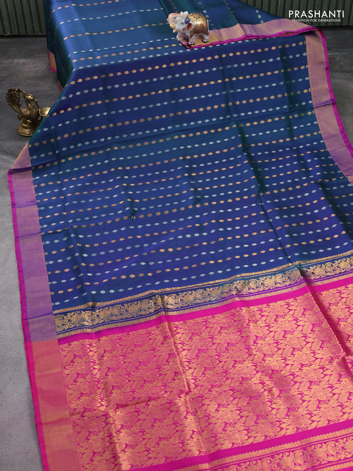 Pure uppada silk saree dual shade of bluish green with allover silver & gold zari weaves and zari woven border