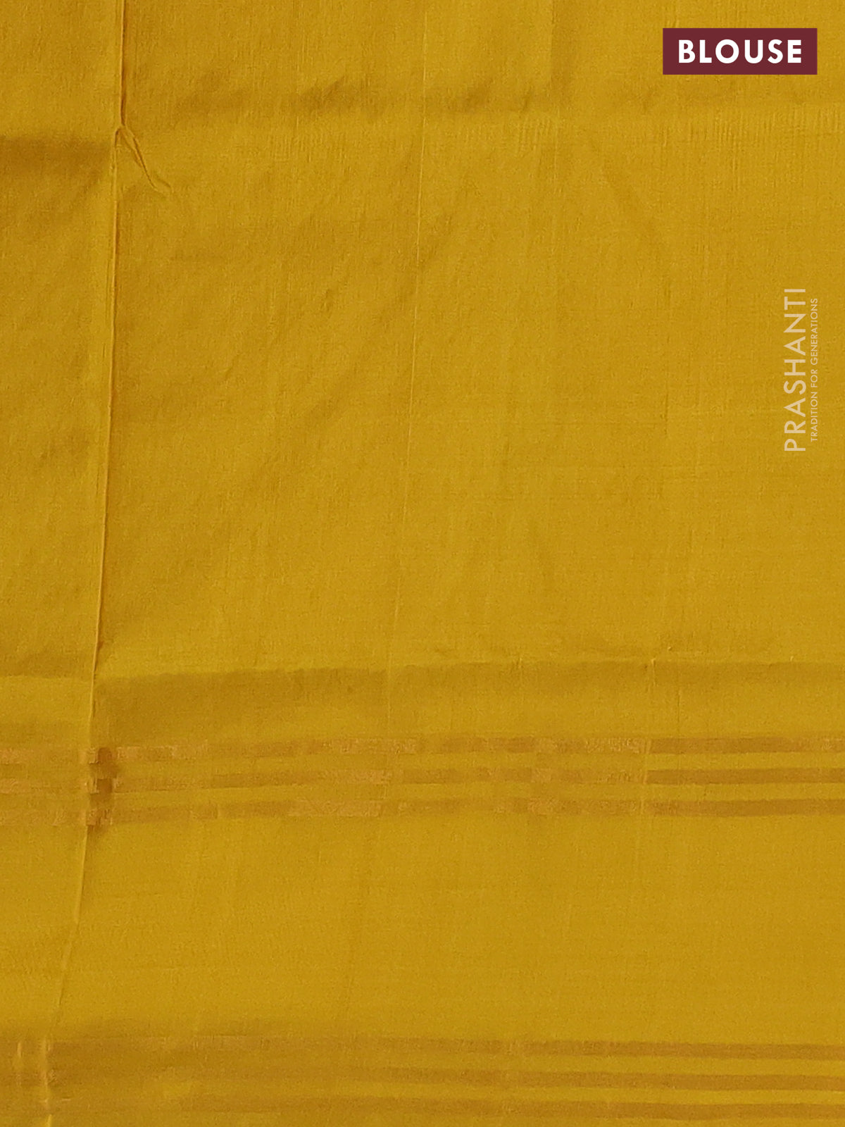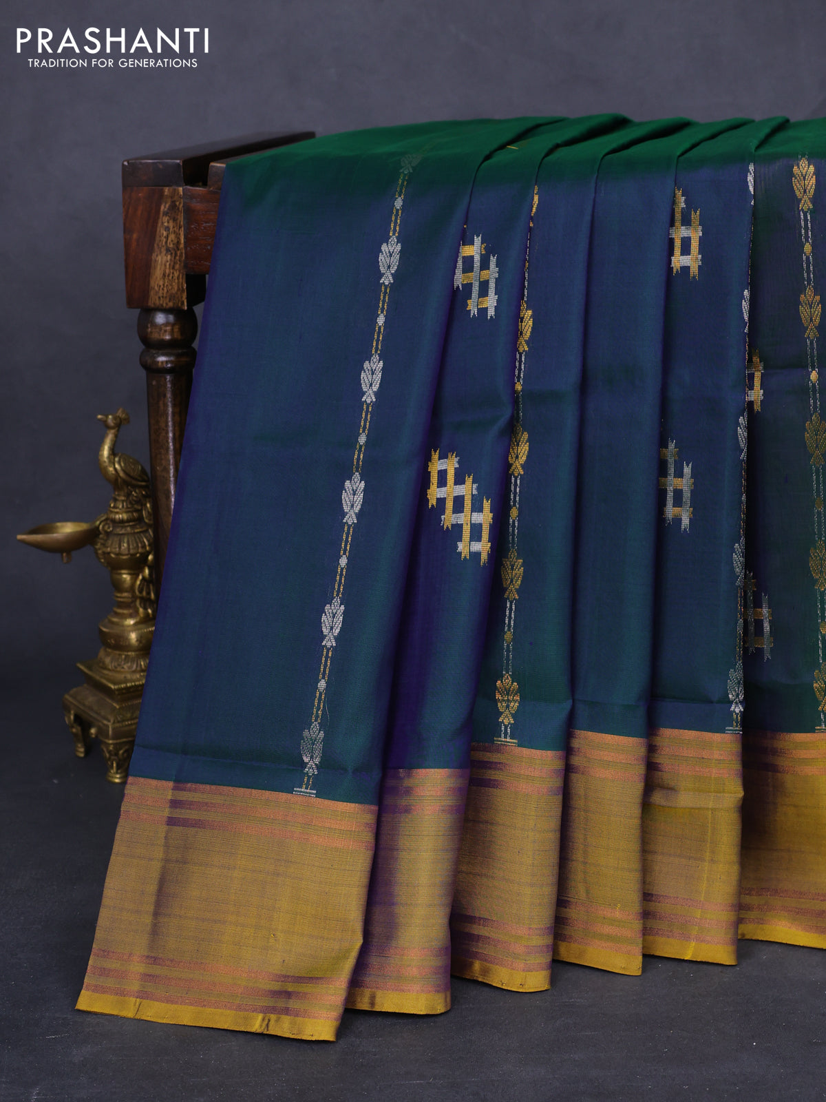 Pure uppada silk saree dual shade of greenish blue and yellow with allover silver & gold zari weaves and rettapet zari woven border