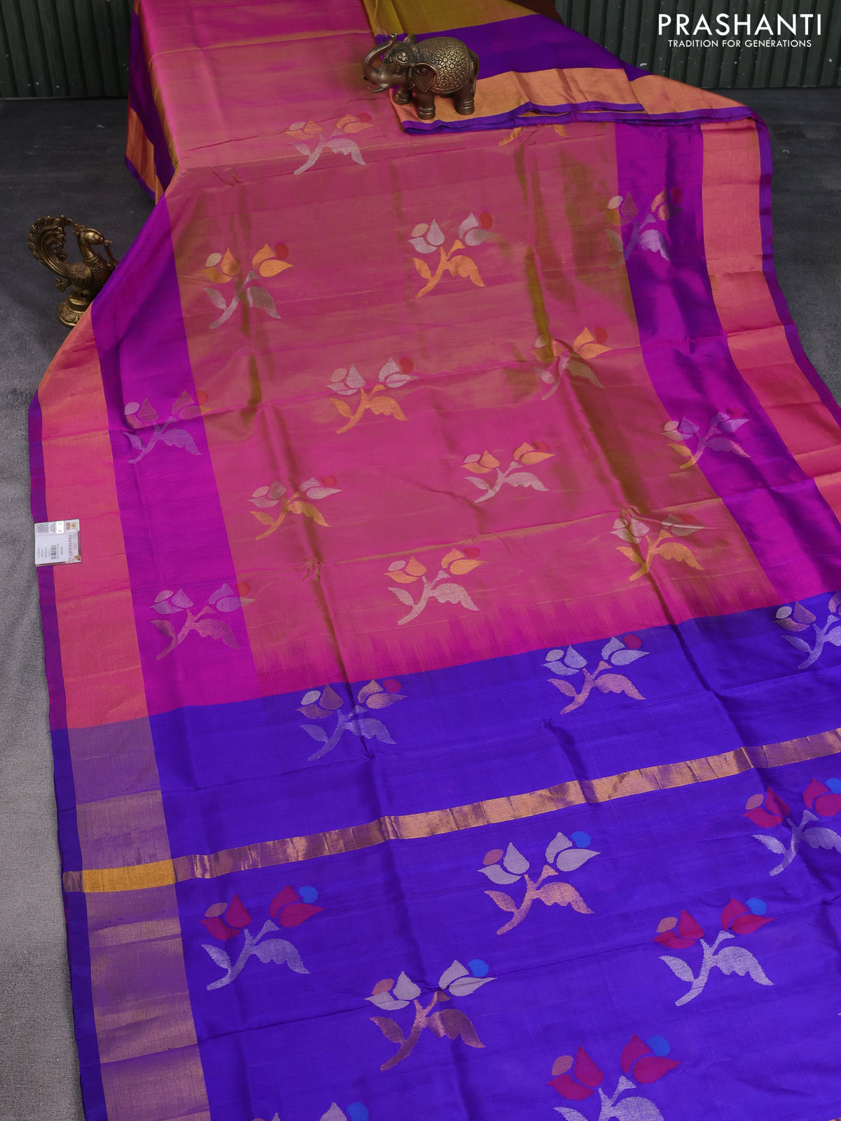 Pure uppada silk saree dual shade of pinkish green and purple with zari woven jamdhani design buttas and zari woven border