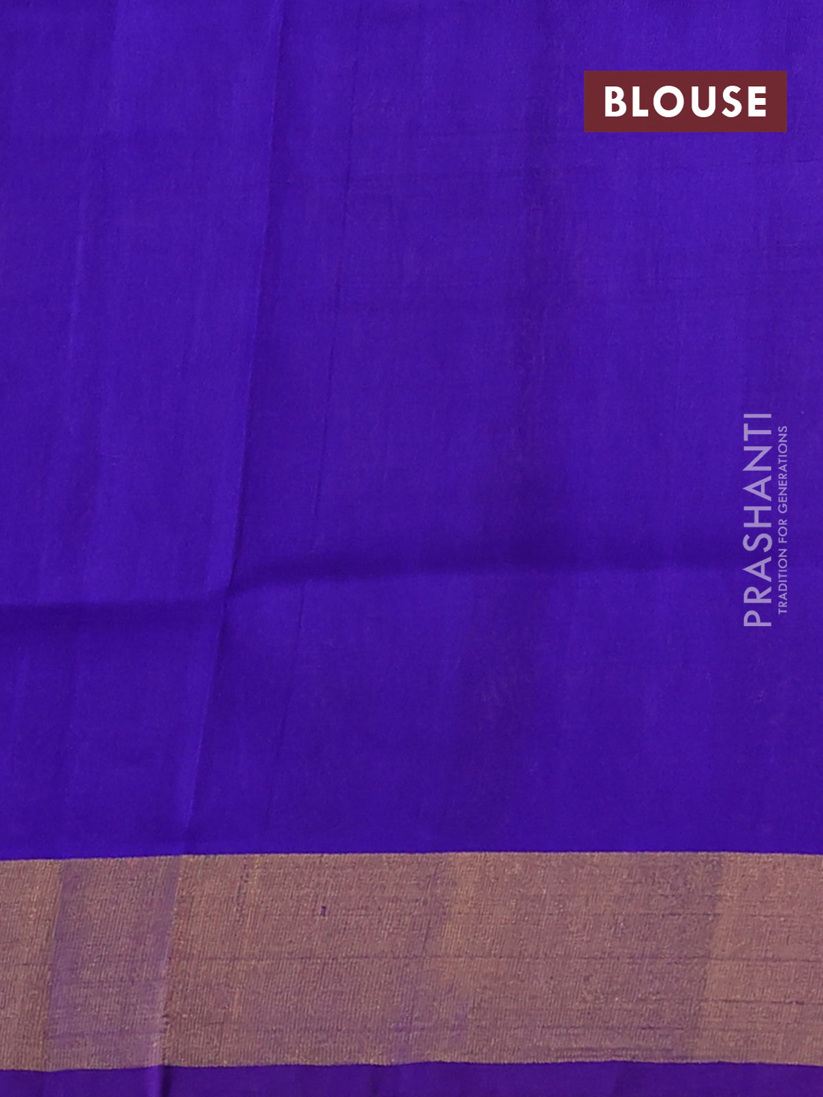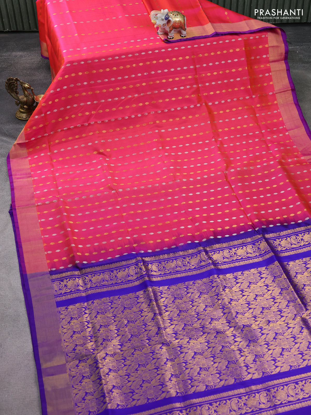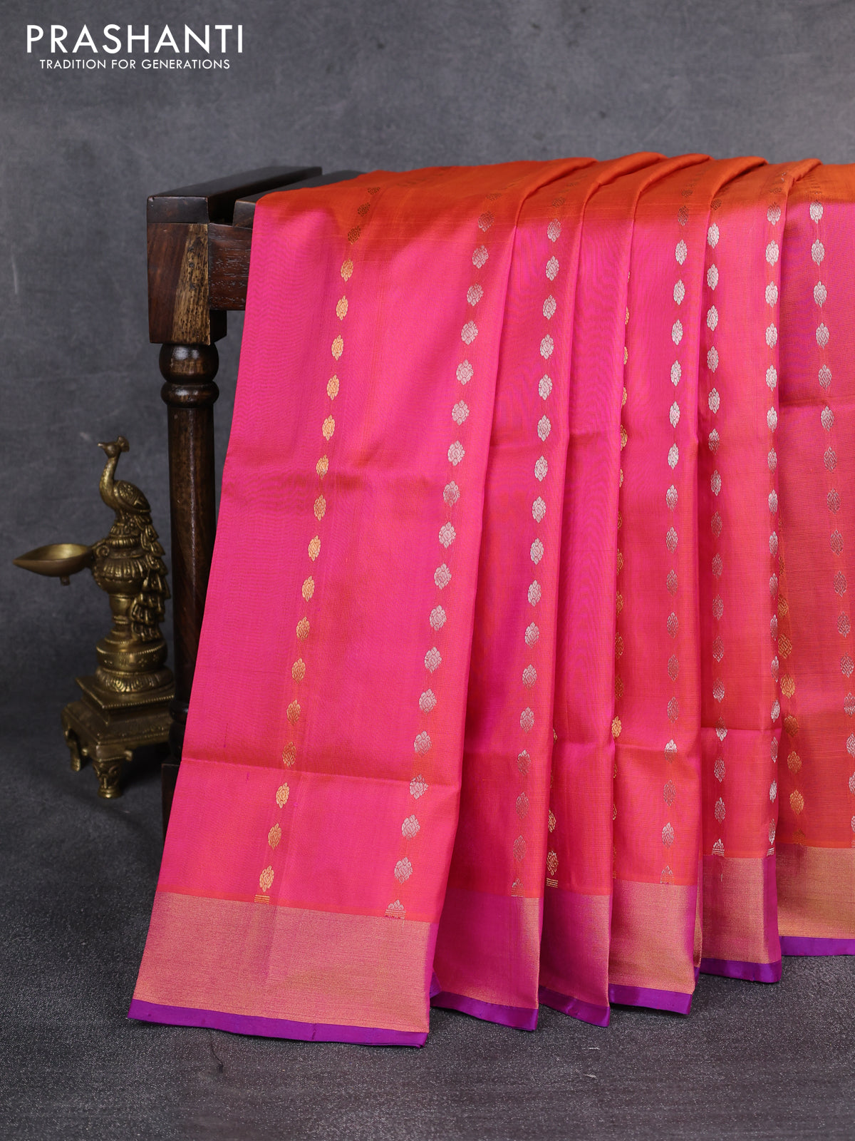 Pure uppada silk saree dual shade of pinkish orange and blue with allover silver & gold zari weaves and zari woven border