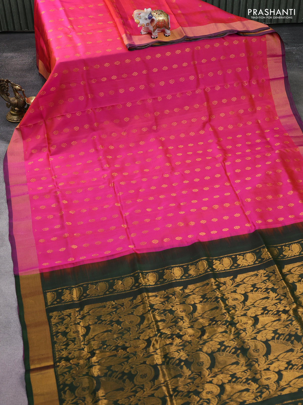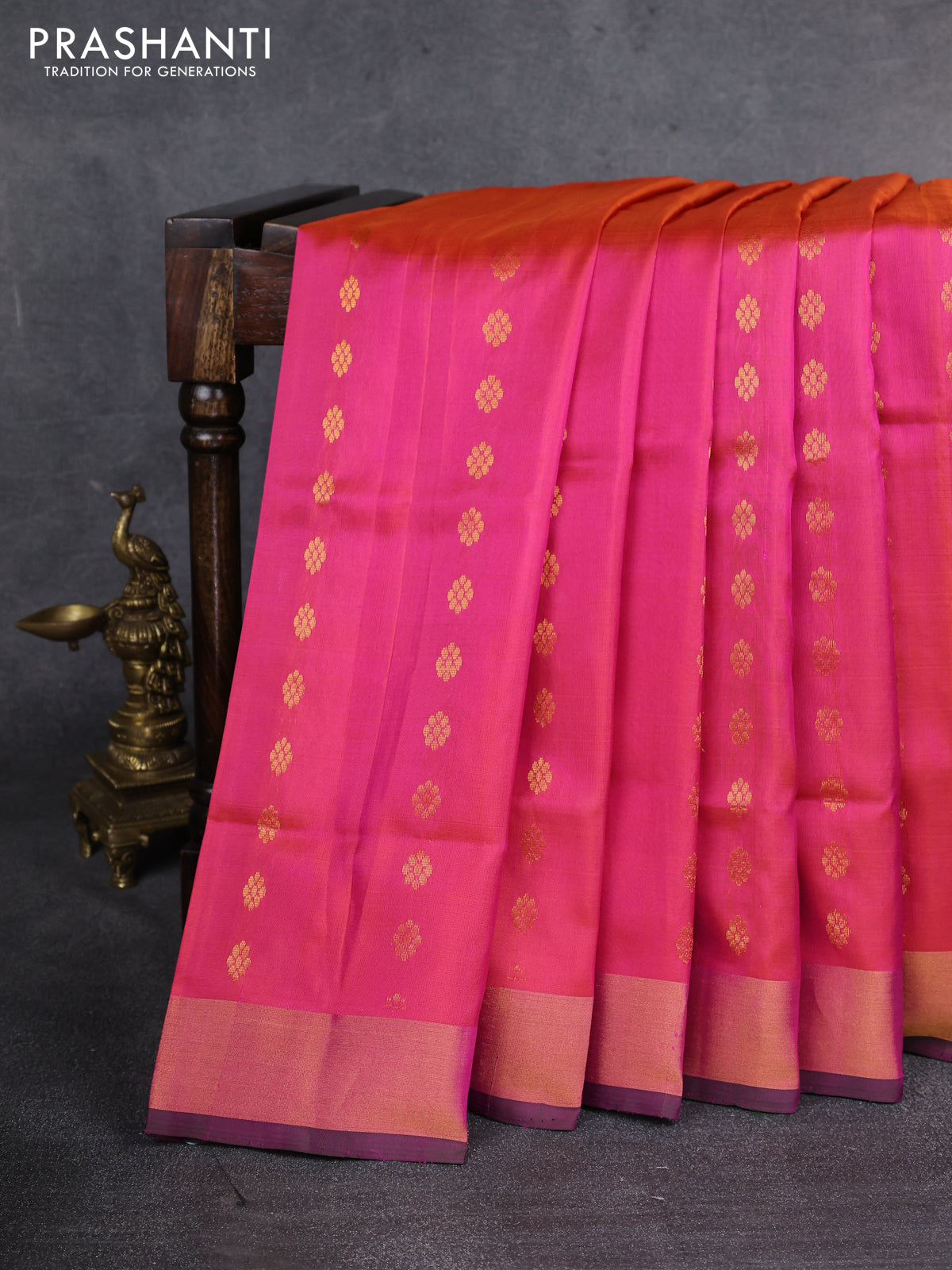 Pure uppada silk saree dual shade of pinkish orange and green with allover zari woven buttas and zari woven border