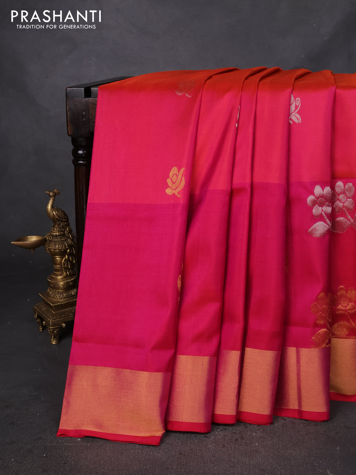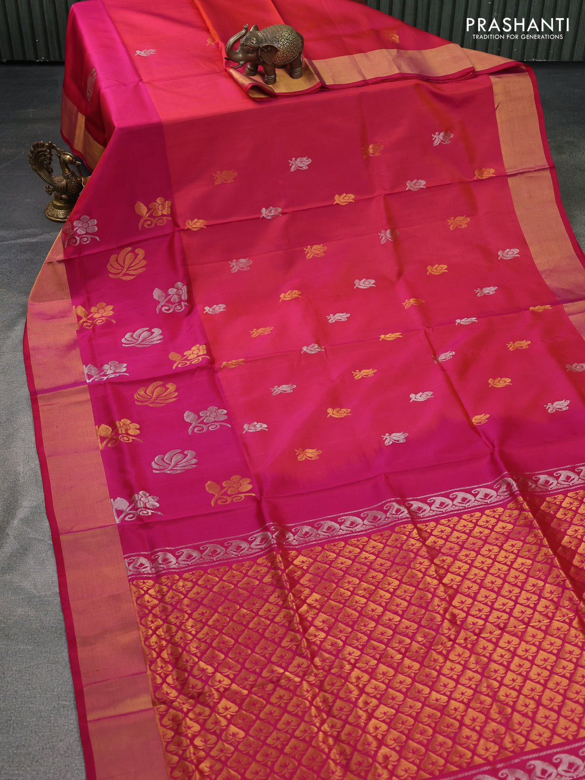 Pure uppada silk saree dual shade of pinkish orange and pink with silver & gold zari woven buttas and zari woven butta border