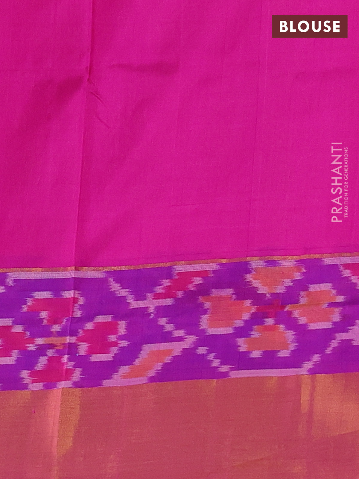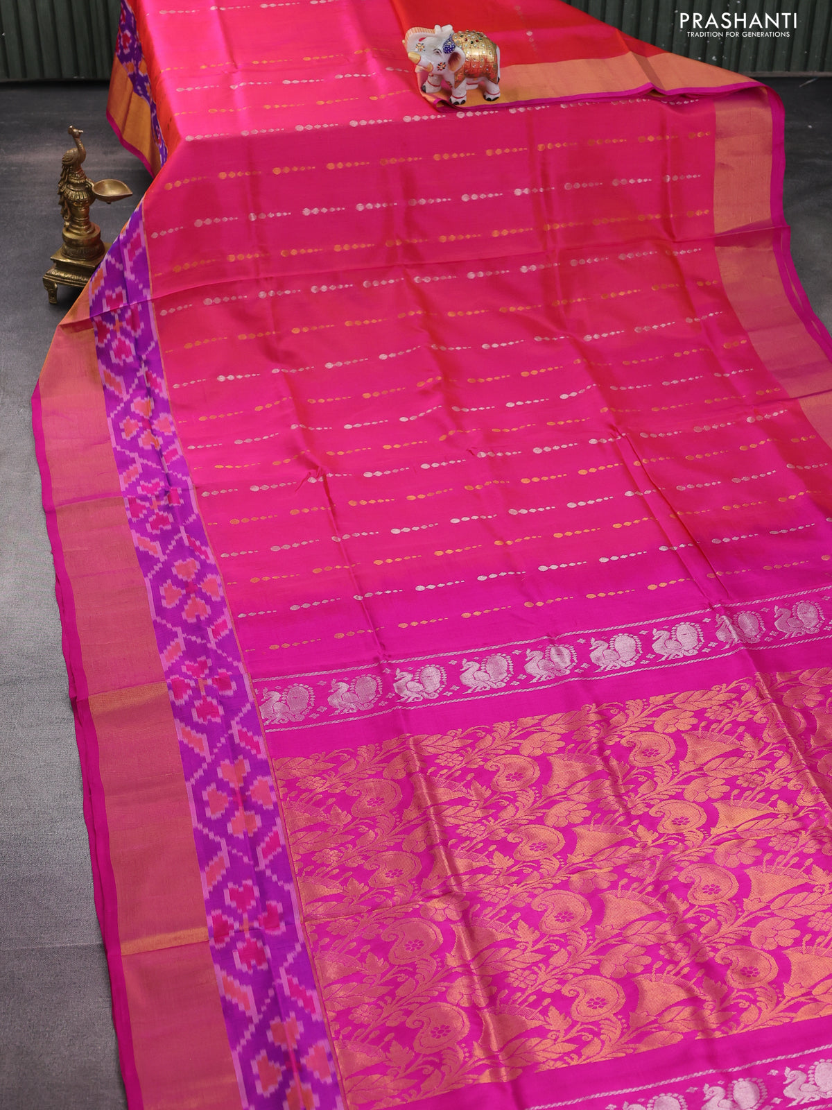 Pure uppada silk saree dual shade of pinkish orange and pink with sllover silver & gold zari weaves and zari woven ikat style border