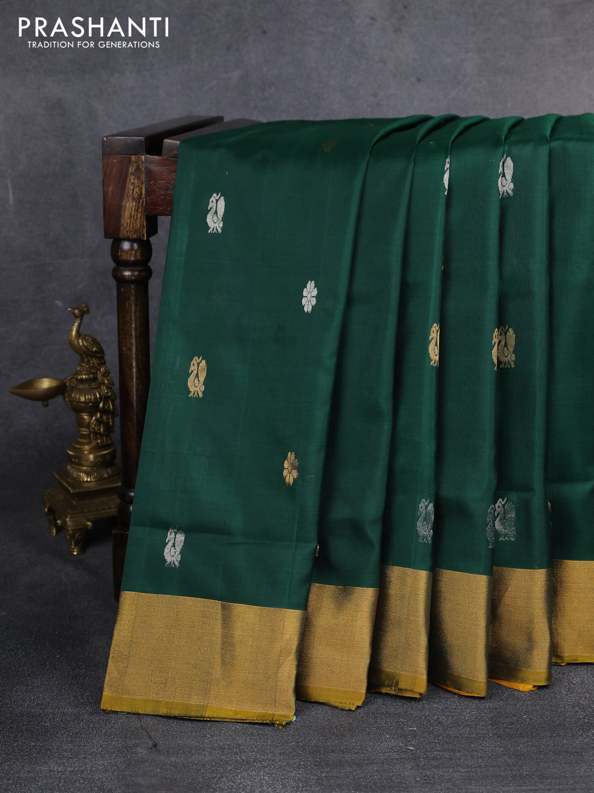 Pure uppada silk saree green and mustard yellow with silver & gold zari woven buttas and zari woven border