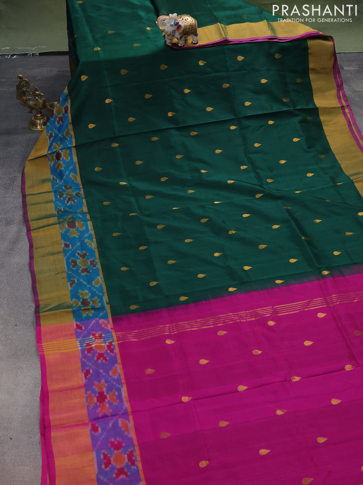 Pure uppada silk saree green and pink with zari woven tilak buttas and ikat woven zari border